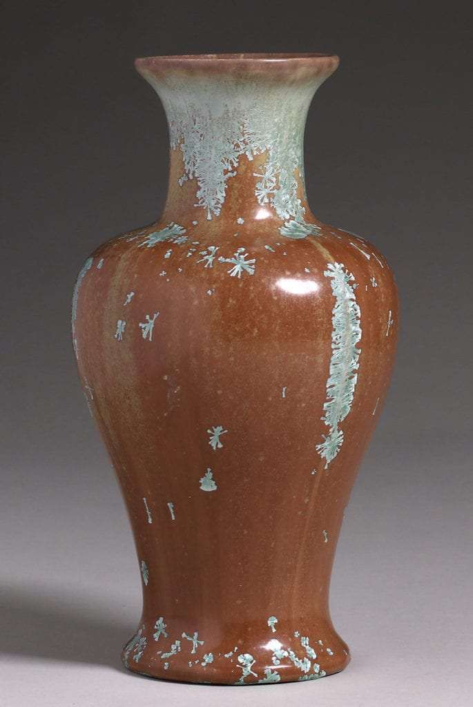 Carl Bergman crystalline vase made for either American Encaustic Tile Co (1916-1919 or Flint Faience Tiling Co (1921-1925). Bergman worked for both and took his glaze with him. Pictured in California Faience page 162. Unsigned. Drilled for a lamp base, otherwise perfect condition. 12.5"h x 6.25"d SOLD