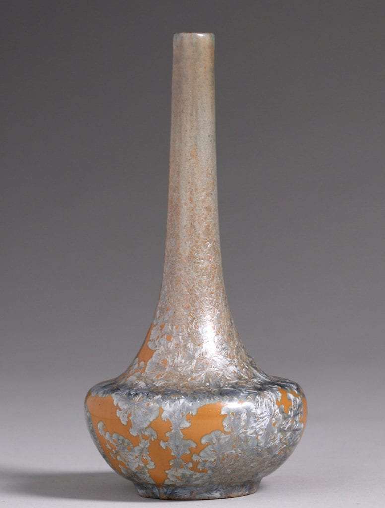 Flint Faience Tiling Co crystalline stem vase c1921-1925. Unsigned. Similar piece pictured in Flint Faience Tiles A to Z on page 95. Slight lean to stem, otherwise perfect condition. 8.5"h x 3.75"d SOLD