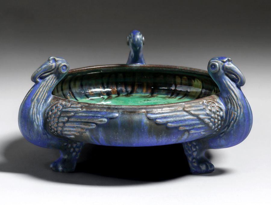 Early Fulper Pottery - Vasekraft Ibis Bowl c1910. Signed. Invisible professional restoration to lines in neck and small edge chips to feet. Excellent definition. 11d x 5.25h inches SOLD