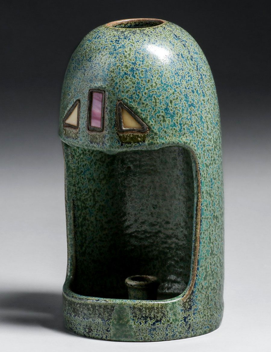 Fulper Pottery #1000 Leaded Glass Candle Sconce c1910. One of the best examples of Fulper glaze we have seen on this form. Signed with original paper label. Small flat base chip, otherwise perfect condition. 10.5″h x 6″d SOLD