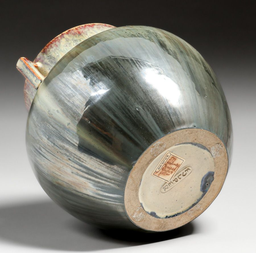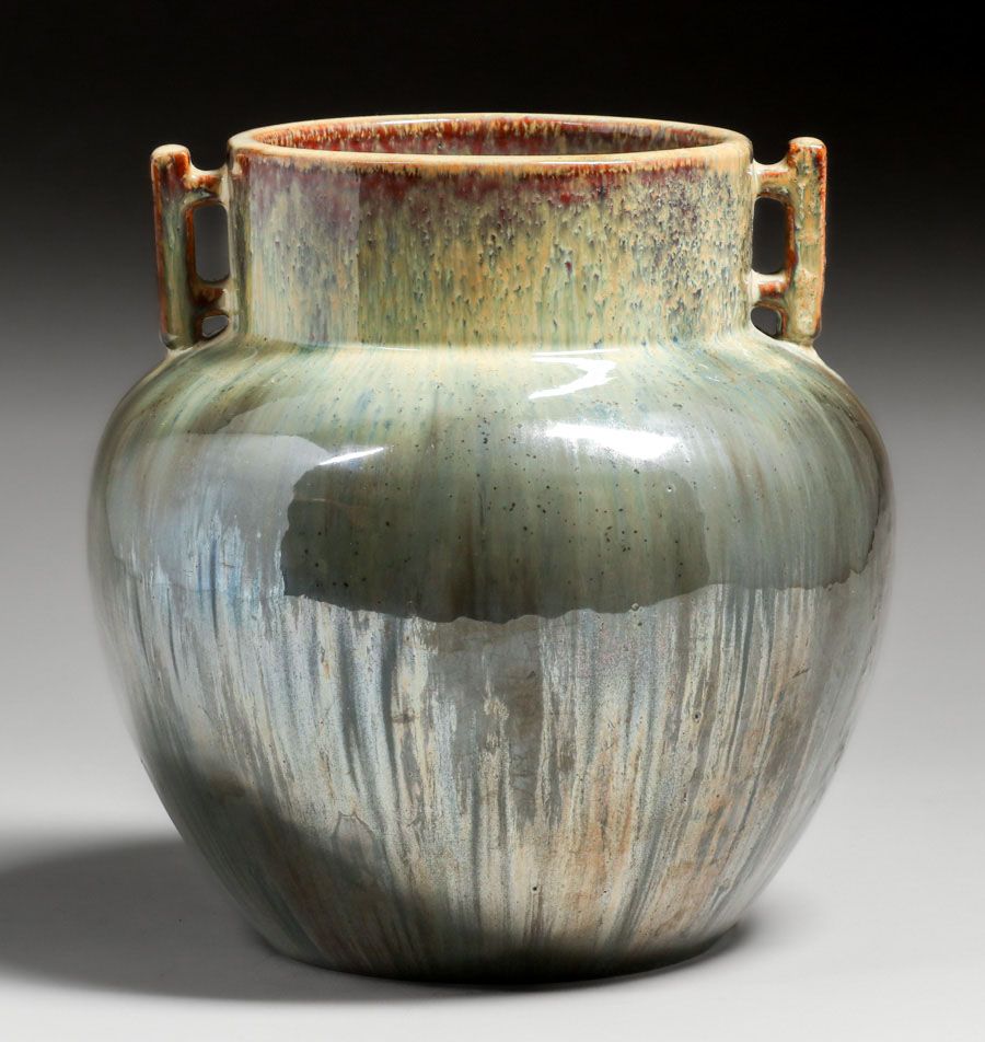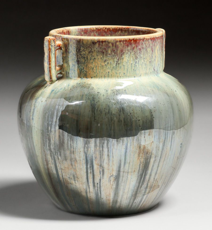 - Fulper Pottery #579 Two-Handled Mirrored Black & Yellow Flambe Vase c1910s