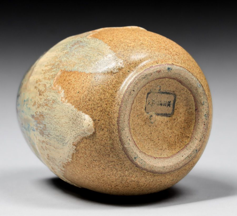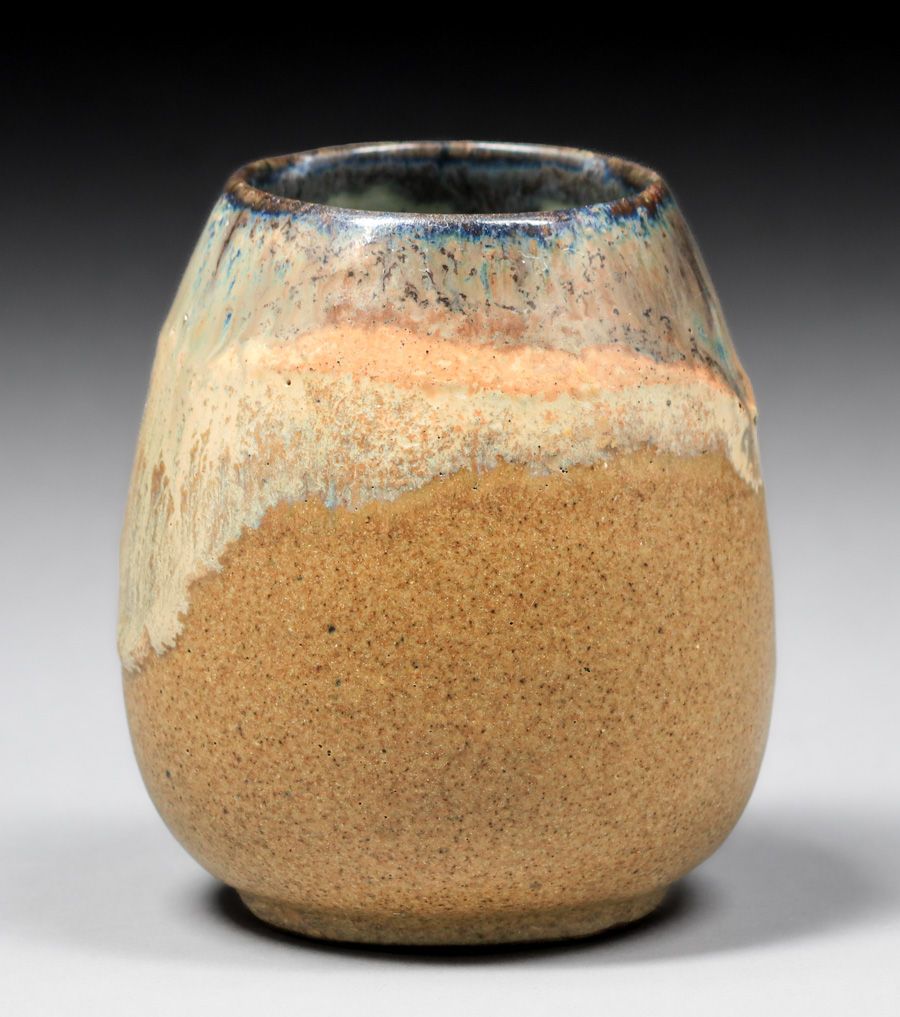 Fulper Pottery Caramel Drip over Matte Mustard Vase c1910. Signed. Invisible professional restoration to tight hairline, otherwise perfect condition. 3.75"h x 3"d SOLD