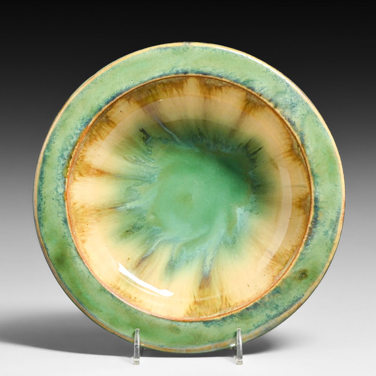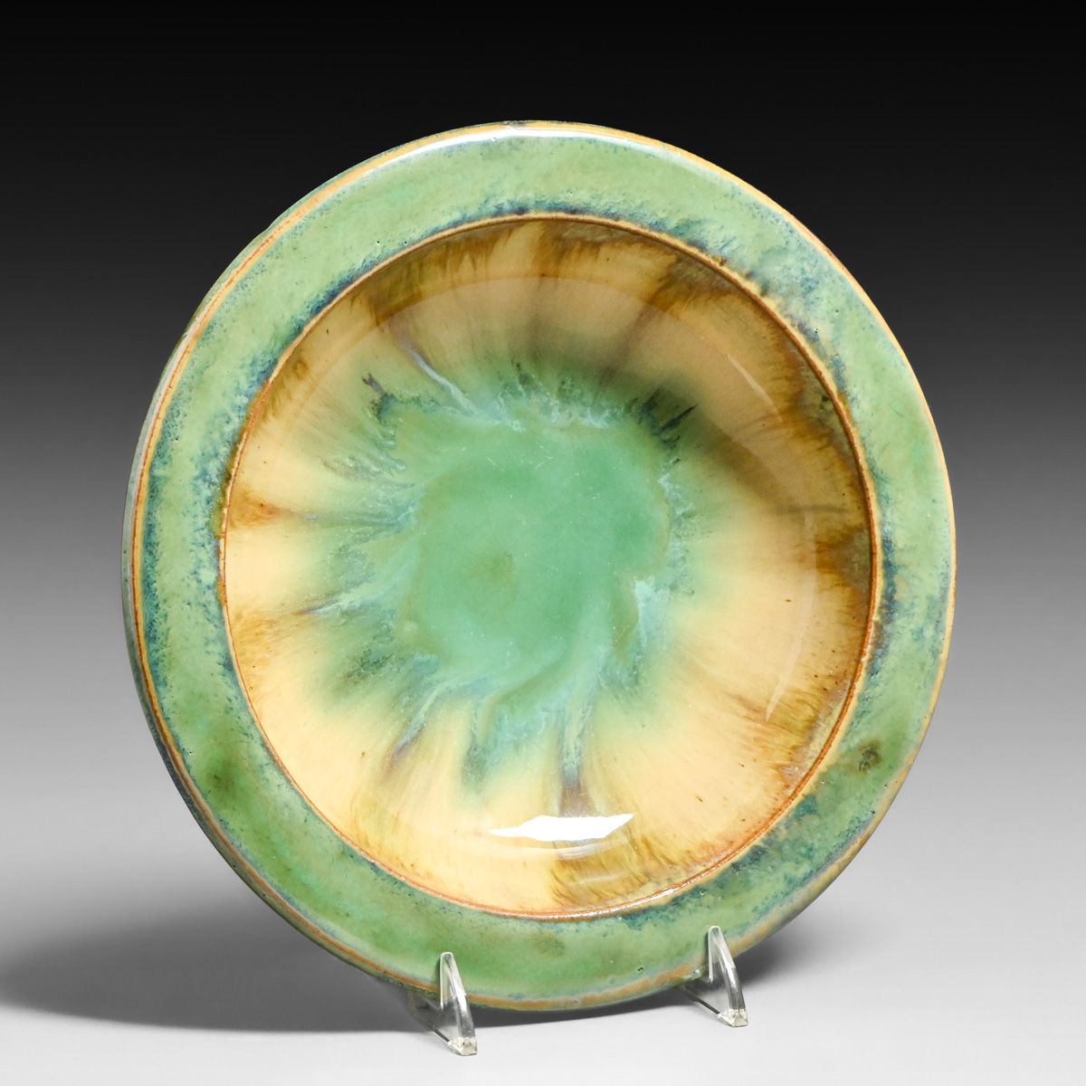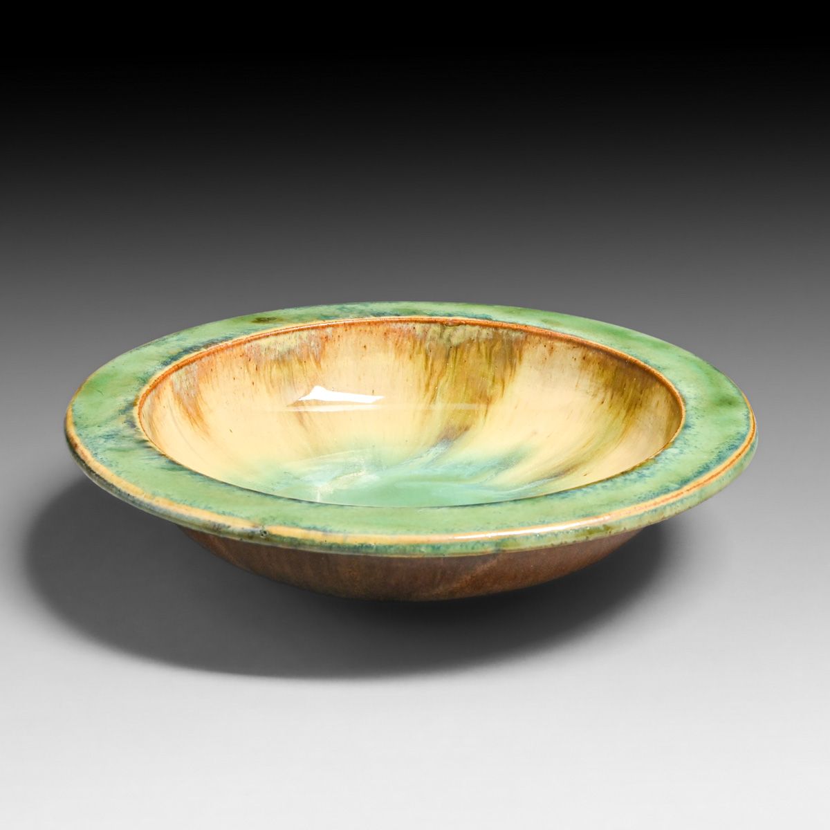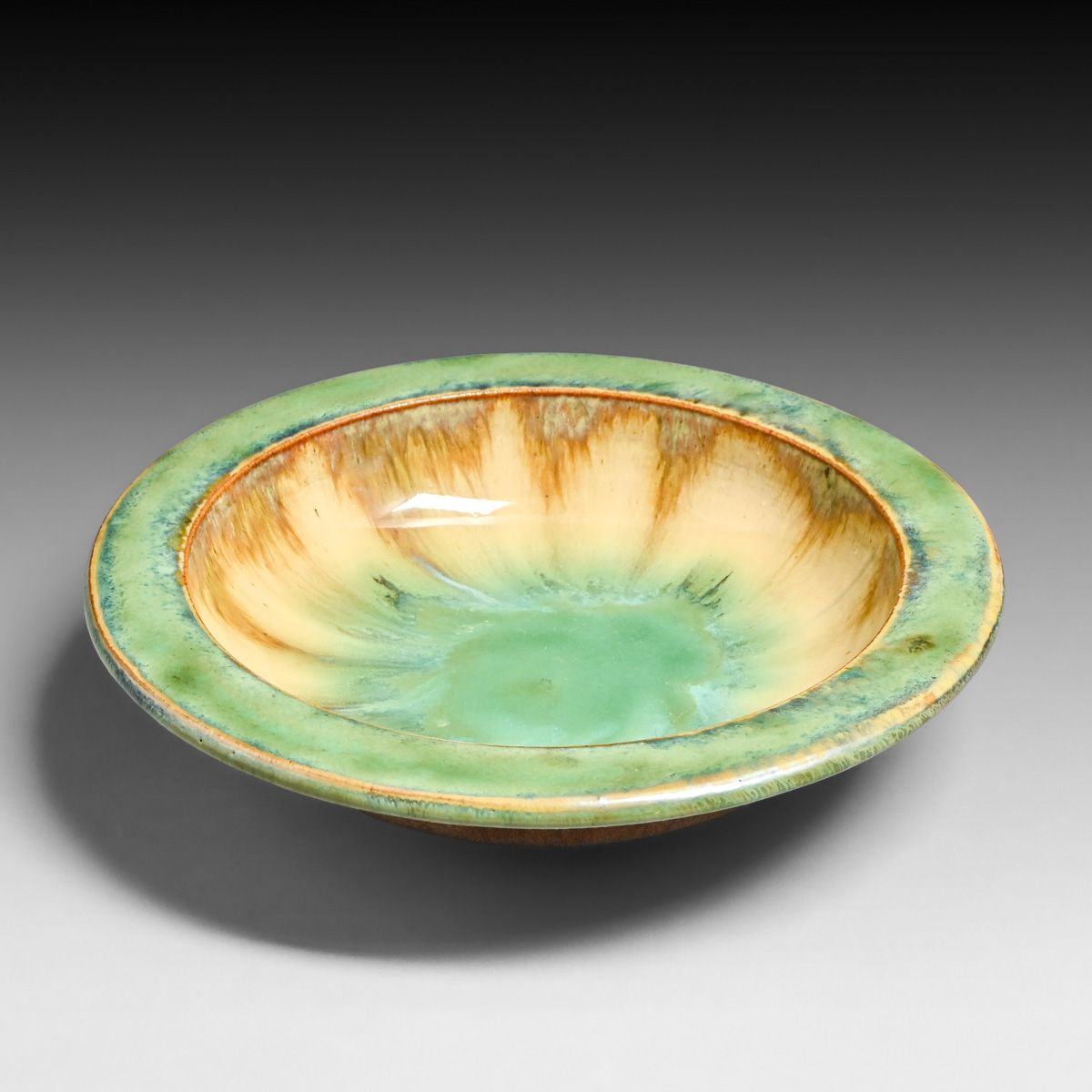 - Fulper Pottery Celadon Green Flambe Flat Rim Bowl c1910