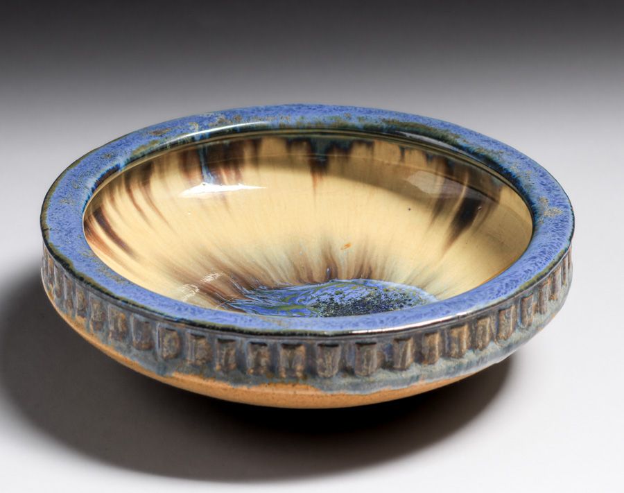 Fulper Pottery Chinese Blue & Matte Mustard Bowl c1910s. Signed. Perfect condition. 8.75”d x 2.5”h SOLD