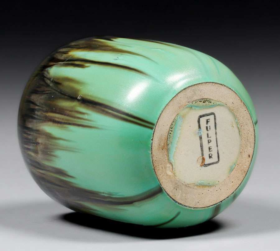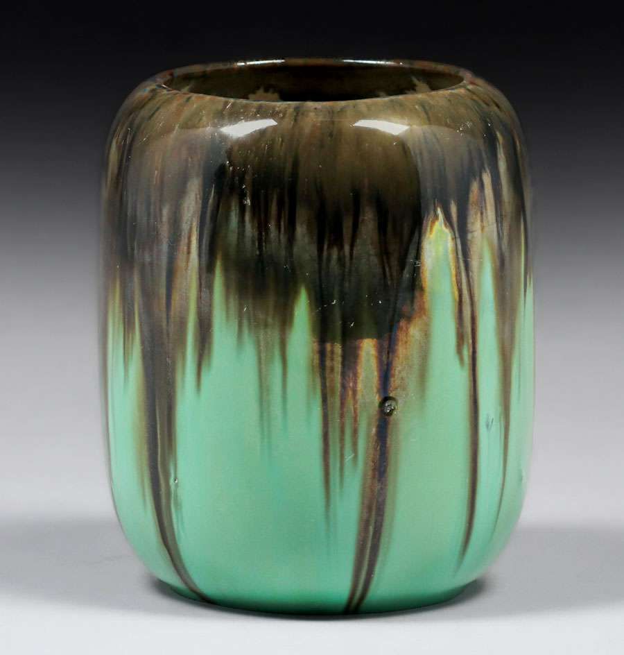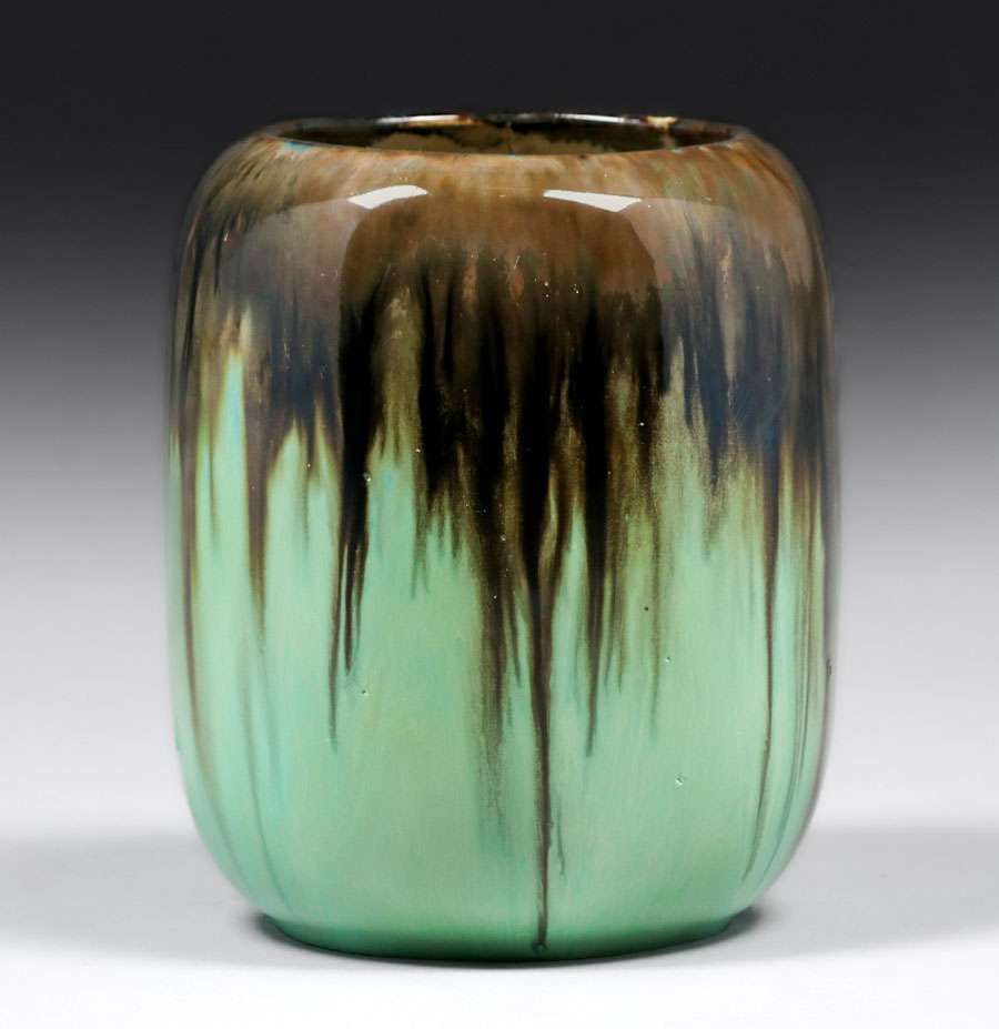 - Fulper Pottery Fat Cylindrical Mirror Black & Green Flambe Vase c1910s