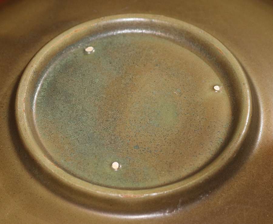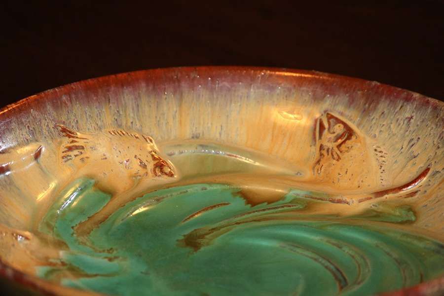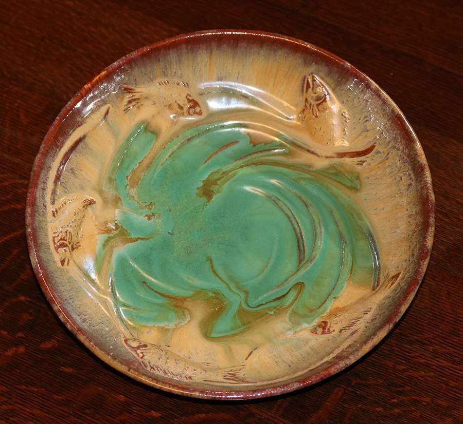 Fulper Pottery fish plate c1910. Glazed over signature. Perfect condition. 11.25"d x 2.75"h SOLD