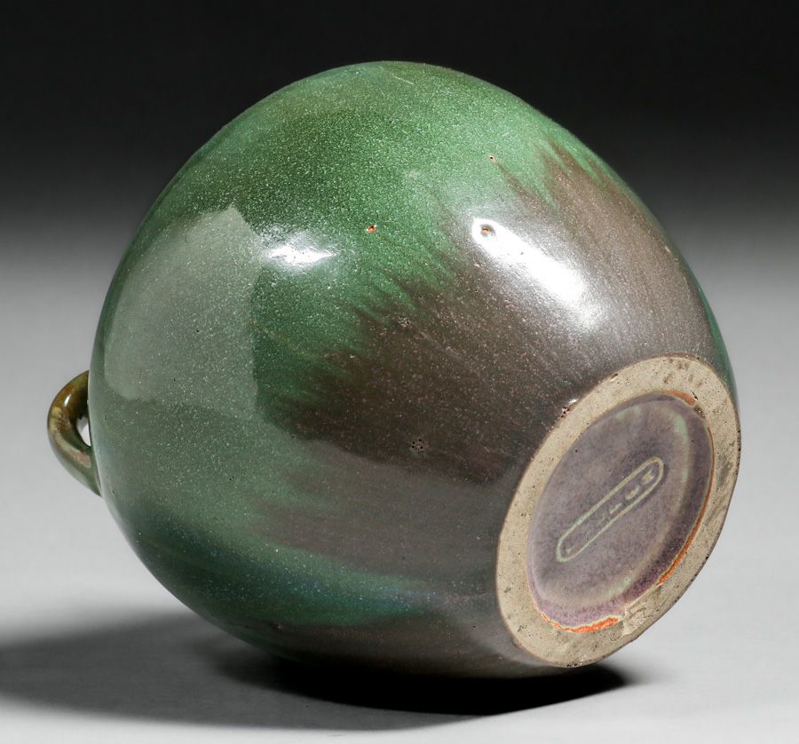 Fulper Pottery Green & Purple Two-Handled Vase c1910. Signed. Grinding chip to base does not show. Perfect condition. 6.75"h x 6.5"d SOLD