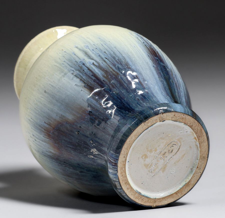Fulper Pottery Ivory & Chinese Blue Flambe Vase c1910. Signed. Perfect condition. 9.5h x 6d inches SOLD