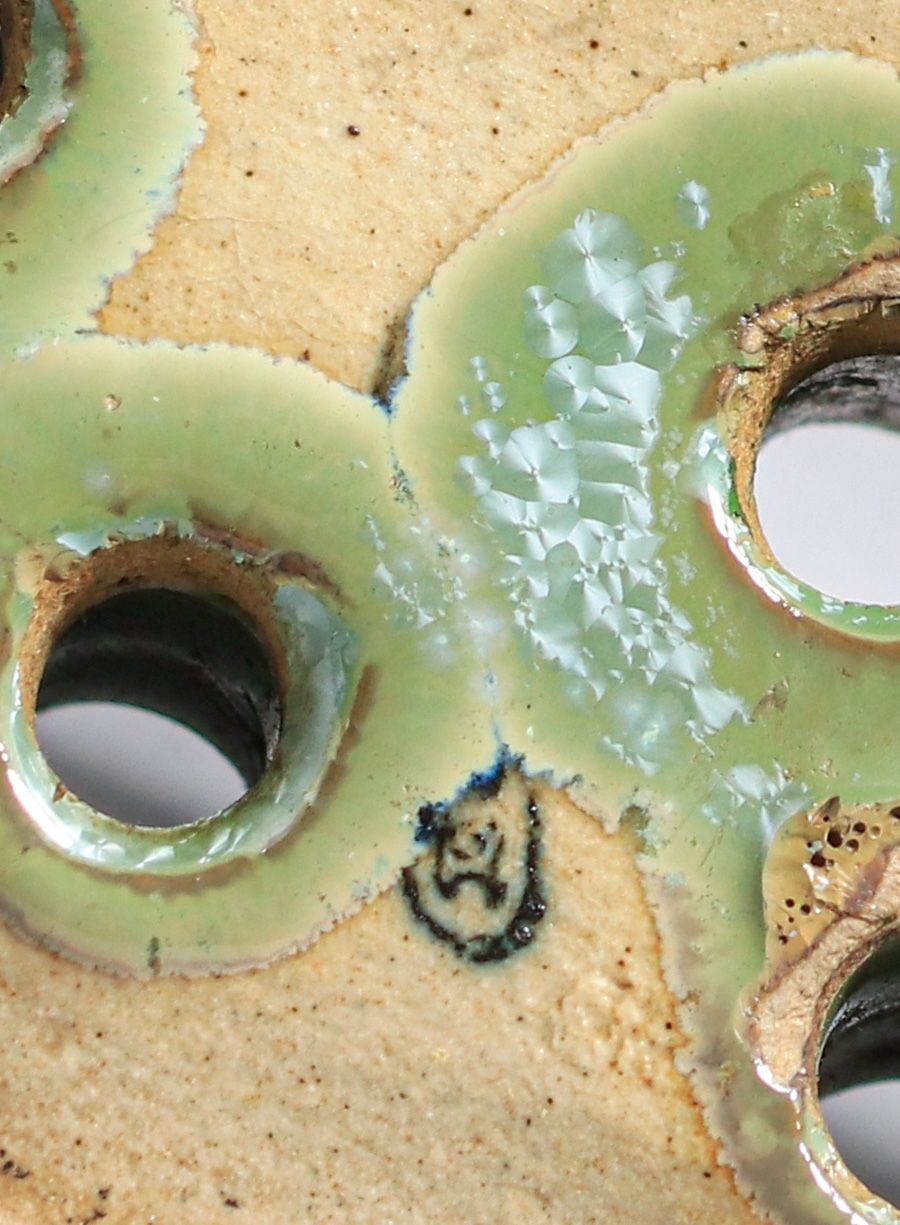 Fulper Pottery Leopardskin Flower Frog c1917-1920. Signed. Small grinding chip at base, otherwise perfect condition. 5.75" x 3.25"w x 1"h SOLD