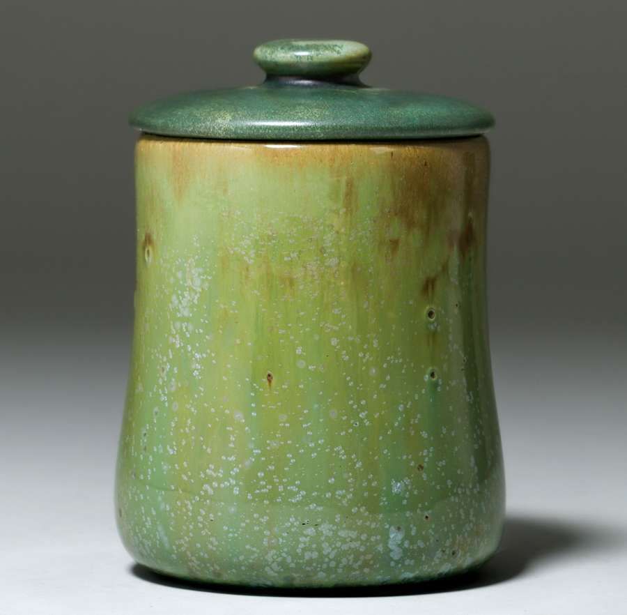 Fulper Pottery Leopardskin Humidor c1910. Glazed over signature. Original lid glaze fired darker than base but original. A couple of glaze bubbles and grinding stilt pull, otherwise perfect condition. 7.75"h x 5.5"d SOLD