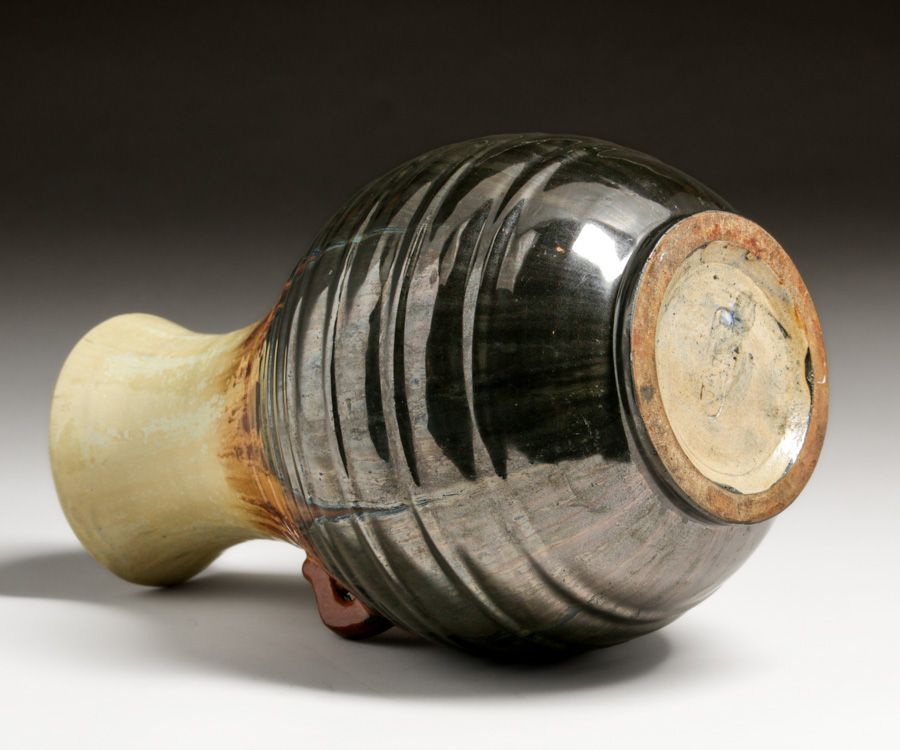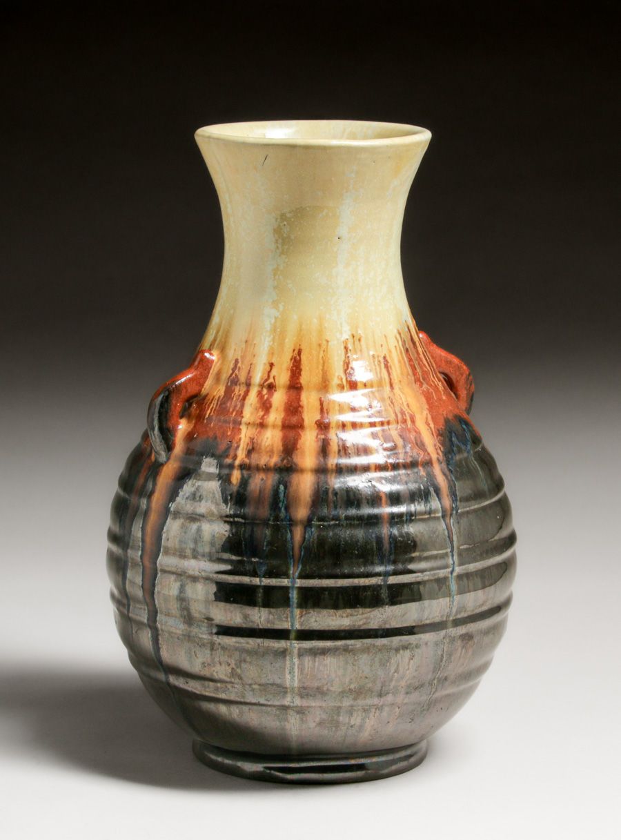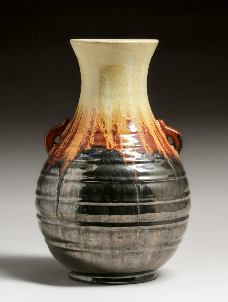 - Fulper Pottery Mirror Black & Cat's Eye Flambé Two-Handled Vase c1910s