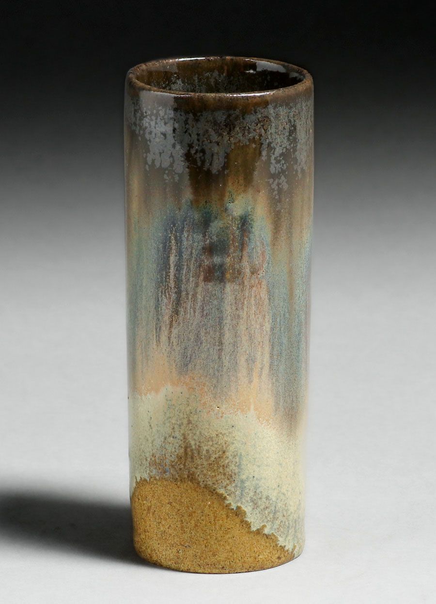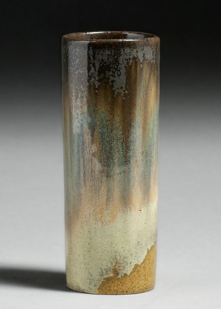 - Fulper Pottery Mirror Black Flambé over Matte Mustard Cylinder Vase c1910