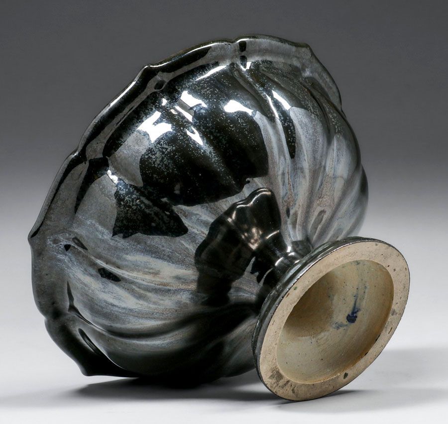 Fulper Pottery Mirror Black Footed Fruit Bowl c1915-1920. Signed. Invisible professional restoration the grinding chips, otherwise perfect condition. 6.25"h x 10.5"d SOLD