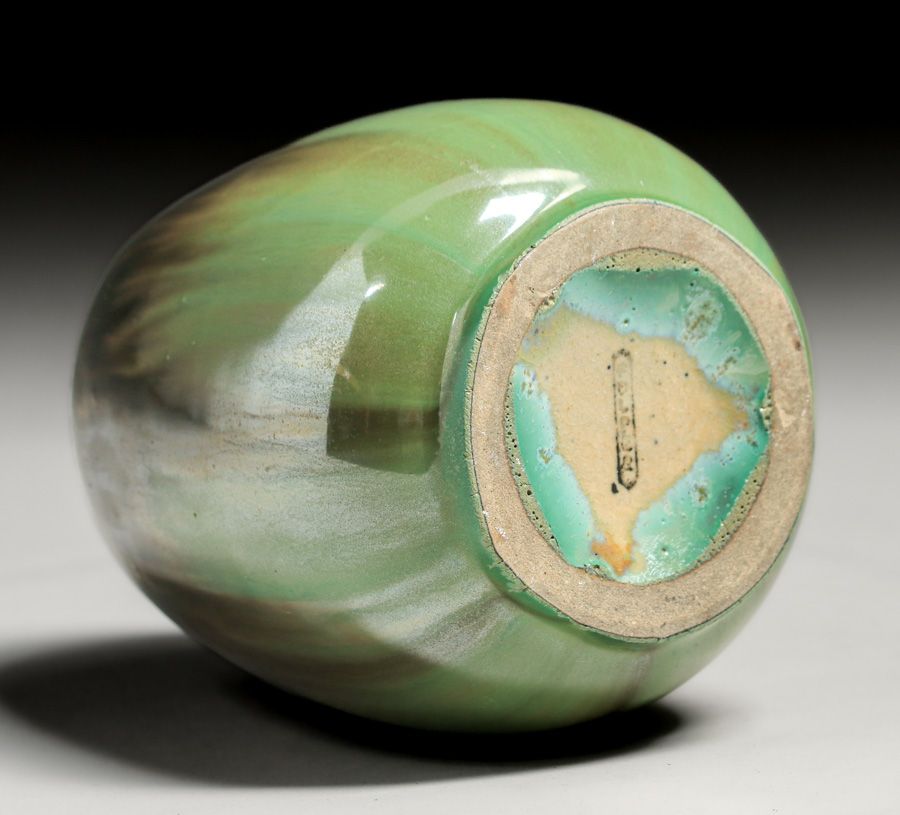 Fulper Pottery Mirror Black & Green Flambe Vase c1910s. Signed. Perfect condition. 3.75"h x 3"d SOLD