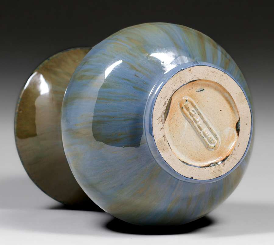 Fulper Pottery Olive Blue Flambe Flared Vase c1910s. Signed. Invisible professional restoration to small base chips, otherwise perfect condition. 6 7/8"h x 5.25"d SOLD