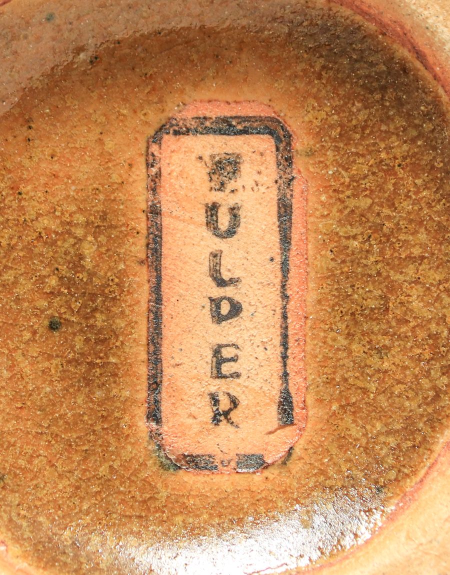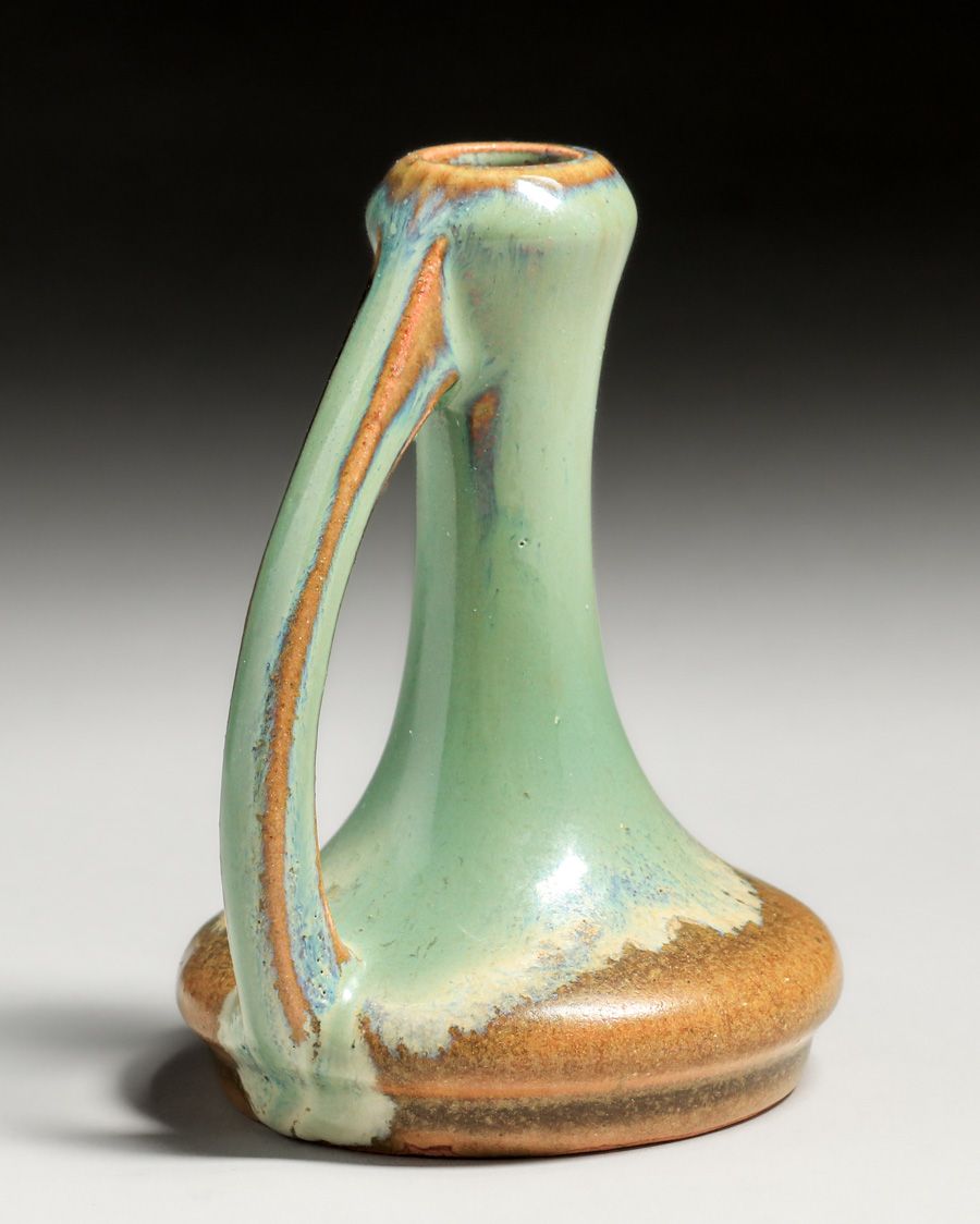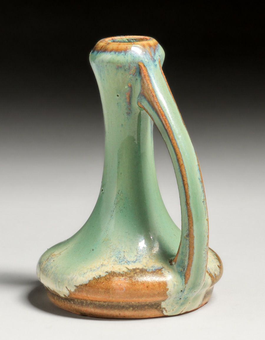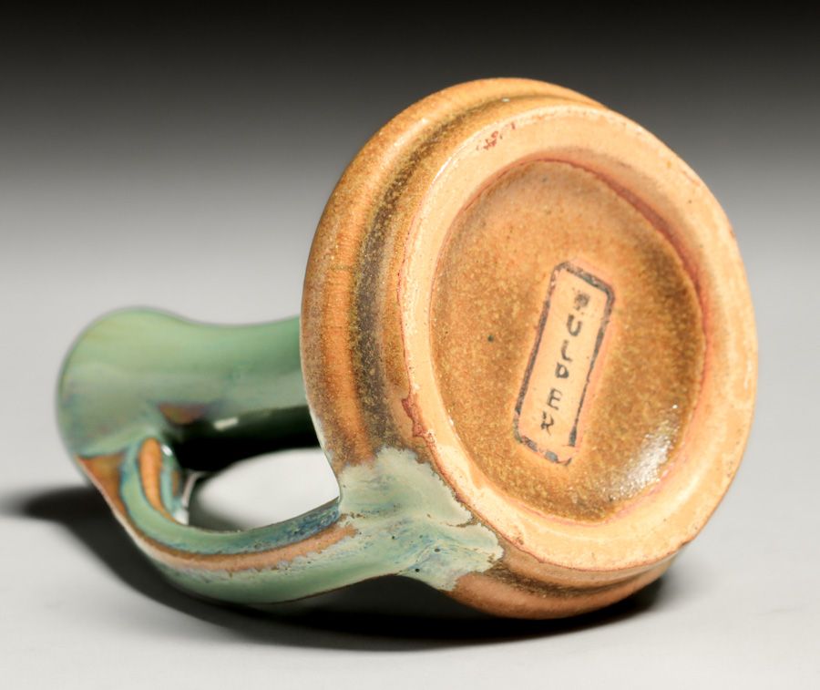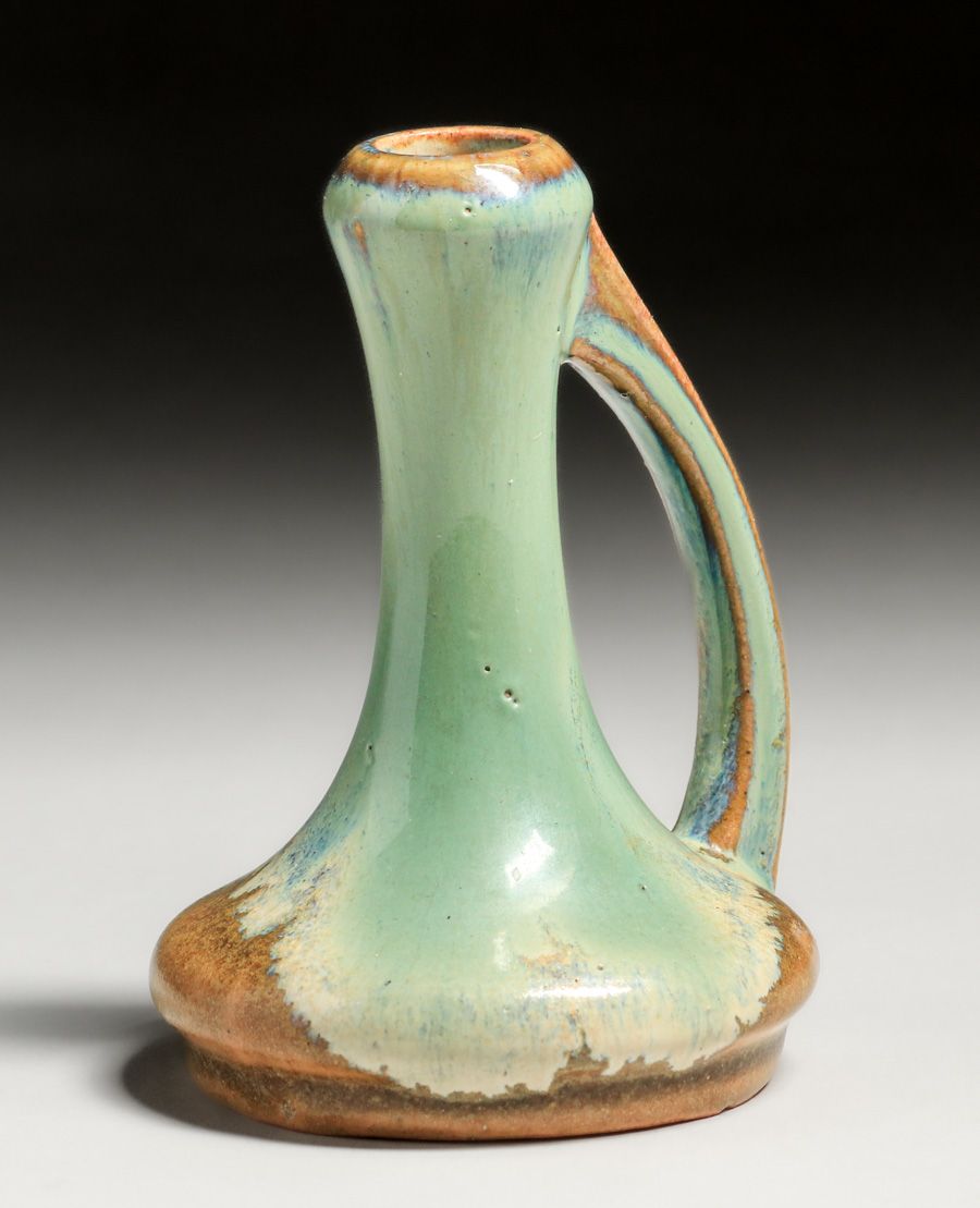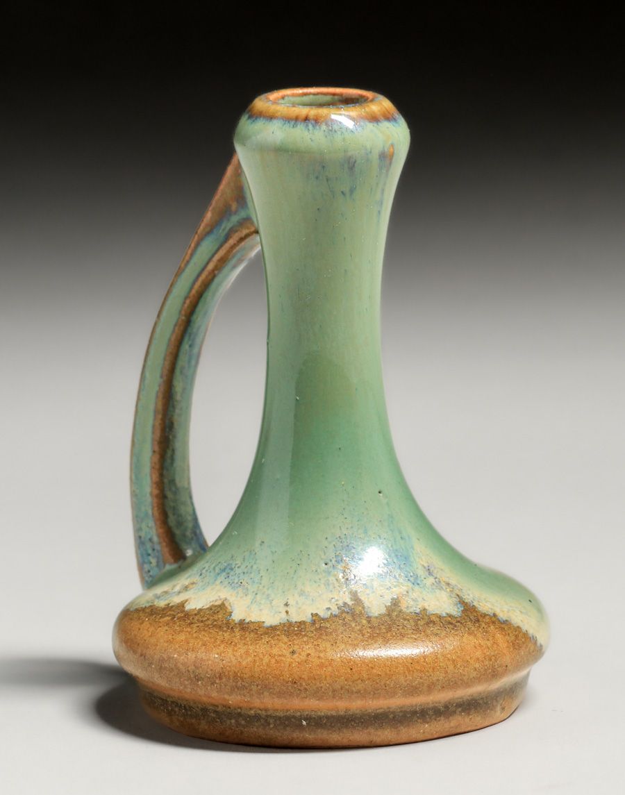 Fulper Pottery One-Handled Green & Mustard Candlestick c1910s. Signed. Perfect condition. 4.5″h x 3.25″w SOLD