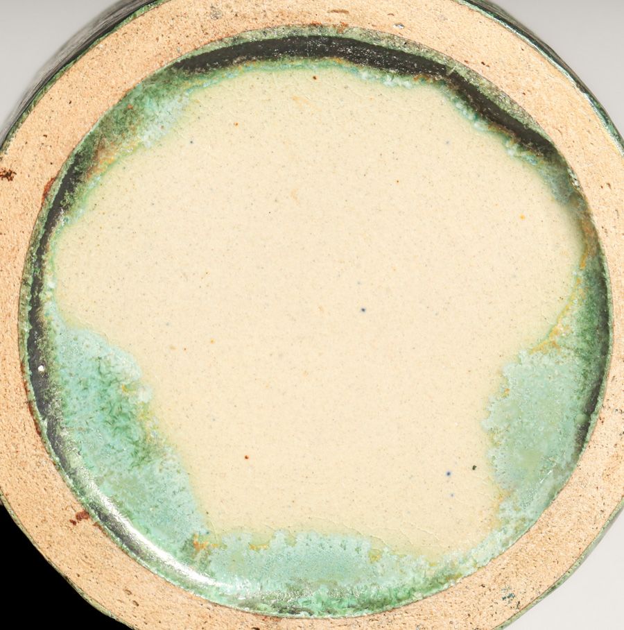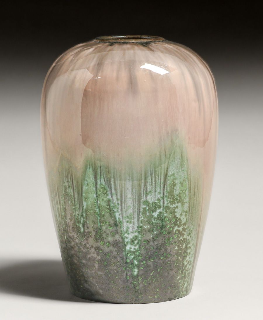 Fulper Pottery Round-Top Vase c1910. Exquisite Elephant’s Breath – Leopardskin Glaze. Unsigned. Invisible professional restoration to a couple of tiny grinding flecks, otherwise perfect condition. 8 3/8″h x 5.5″d SOLD