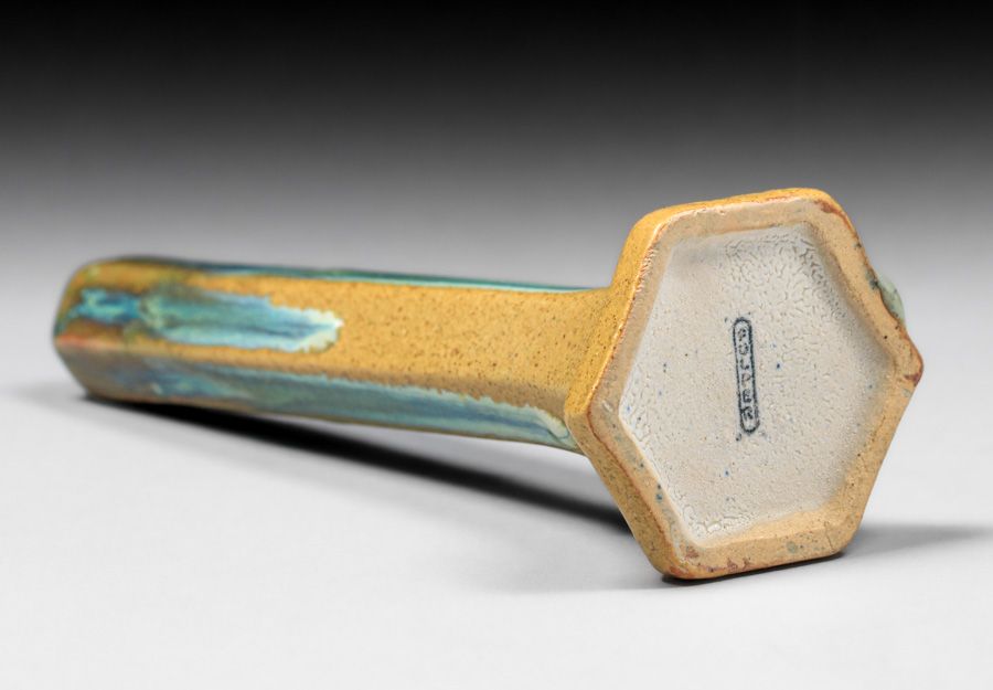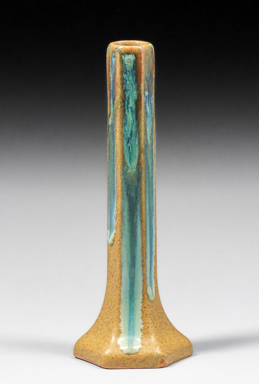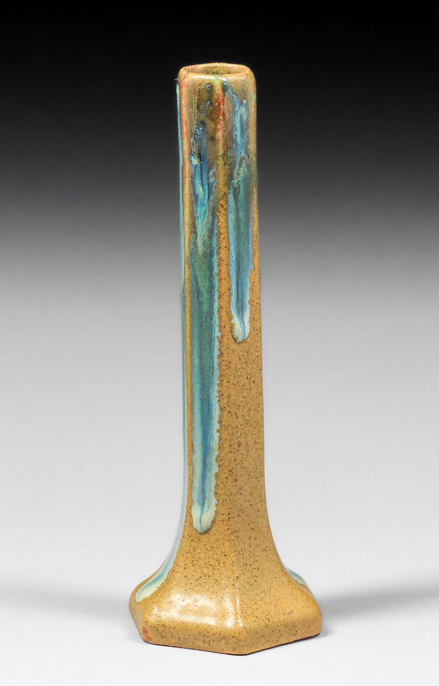 Fulper Pottery Six-Sided Vase c1910s. Signed. Invisible professional restoration to small base chip, otherwise perfect condition. 7″h x 2.5″d SOLD