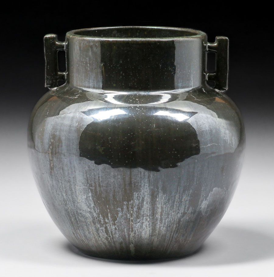 Fulper Pottery Speckled Mirror Black Two-Handled Chinese Form Vase c1910s. Signed. Invisible professional restoration to tight hairline, otherwise perfect condition. 9.25"h x 9"d $950