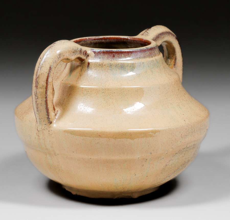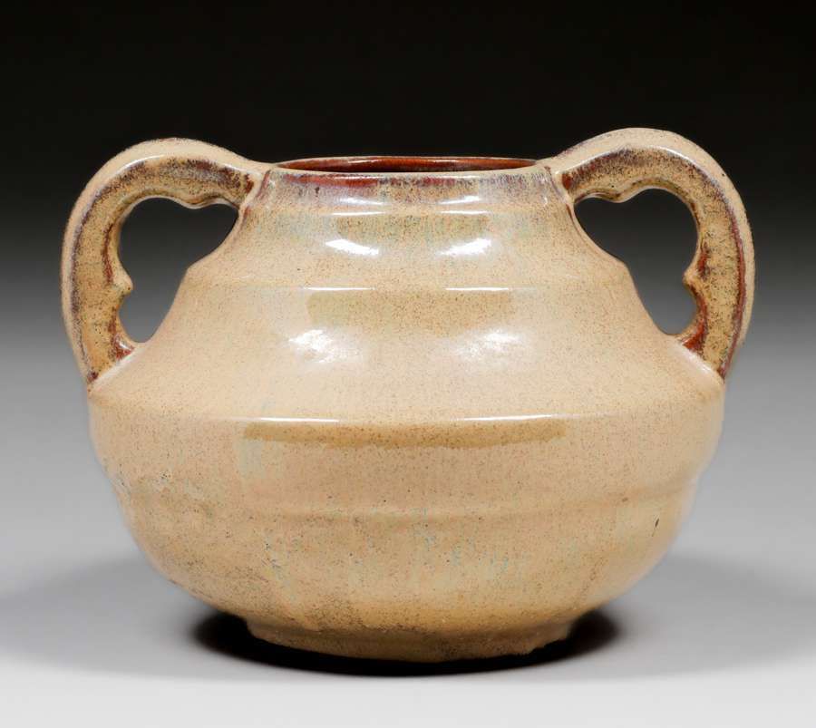 Fulper Pottery #T25 Two-Handled Mustard & Mahogany Vase c1920. Signed. Perfect condition. 7"h x 9.5"w $450