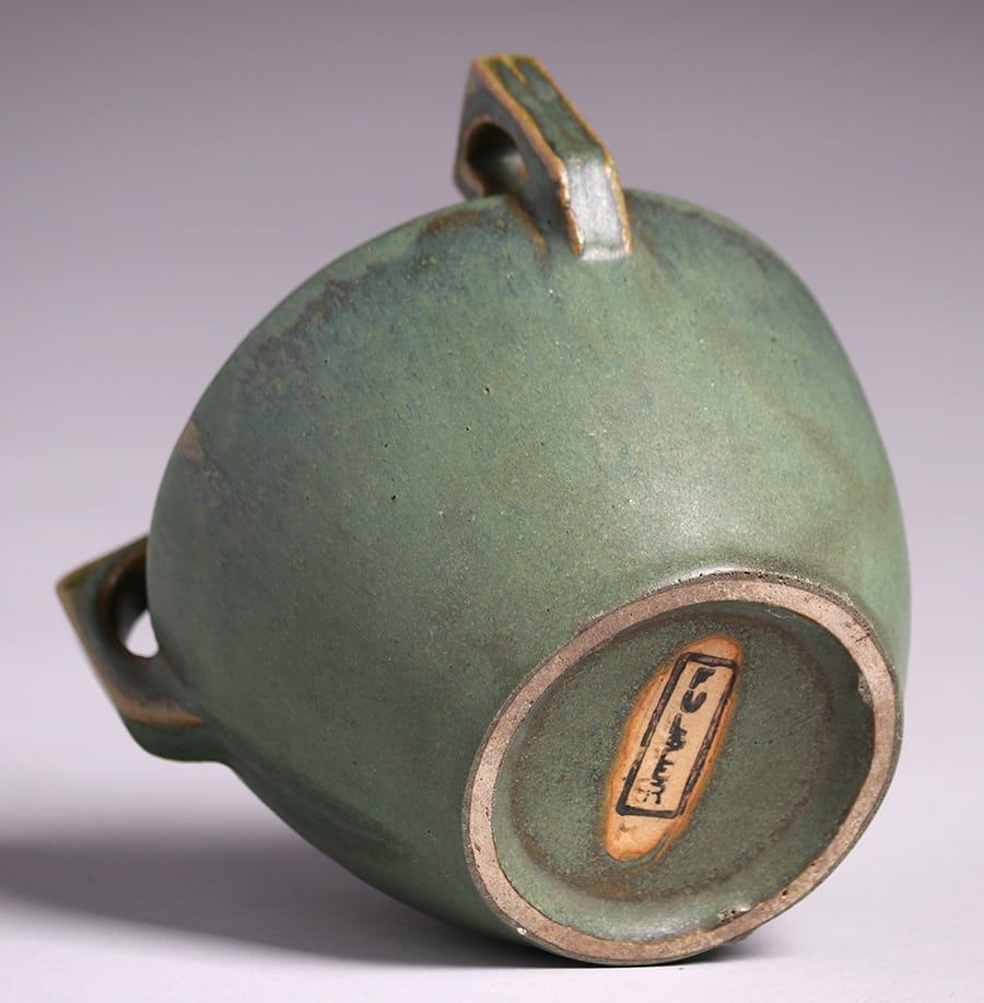 Fulper Pottery three-handled matte green vase. Signed. Slight separation in one handle during production, otherwise perfect condition. 4.25"h x 4.5"d SOLD