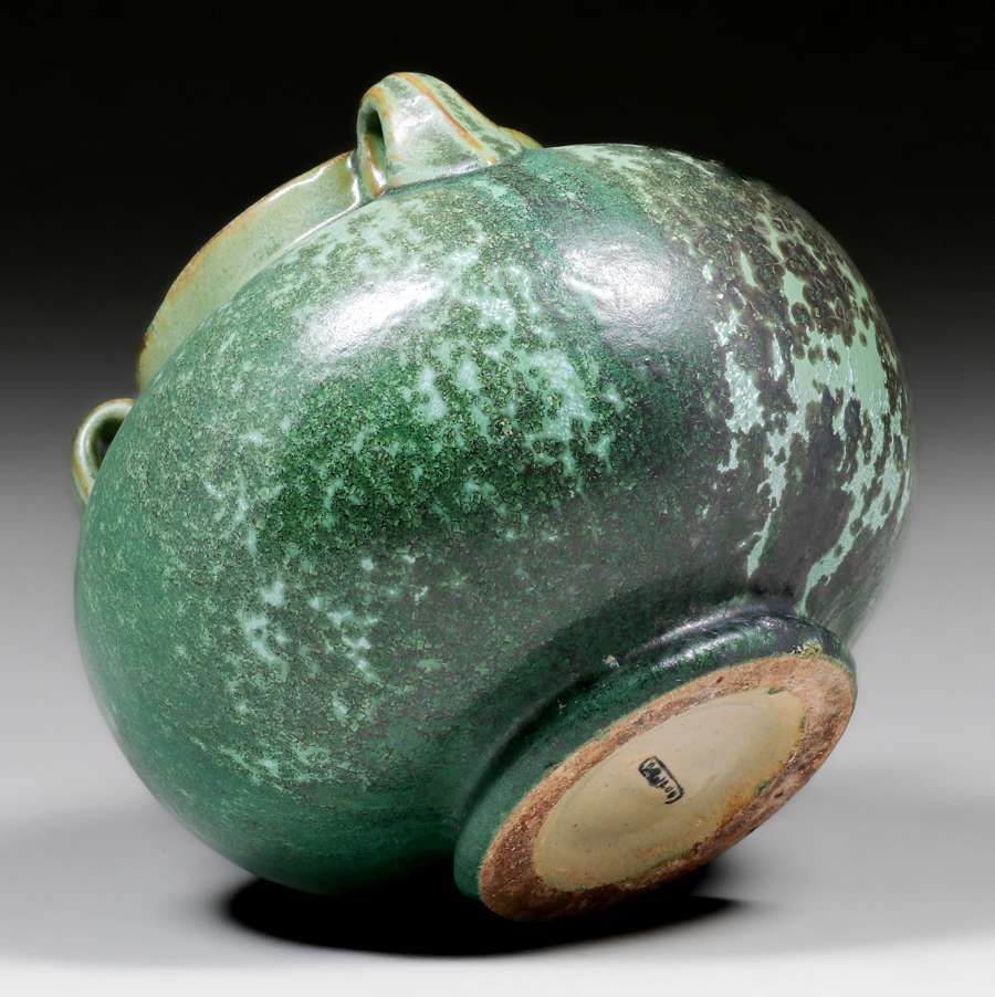 Fulper Pottery Three-Handled Leopardskin Vase c1910. Signed. Invisible professional restoration to small rim chips, otherwise perfect condition. 6.5"h x 8"d SOLD
