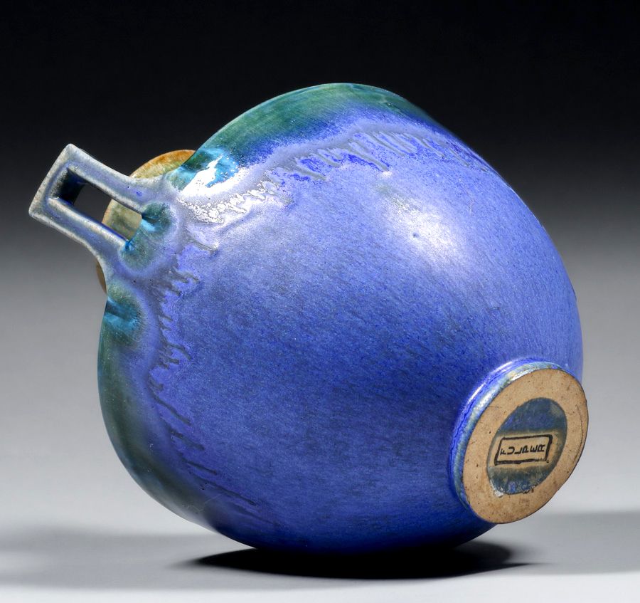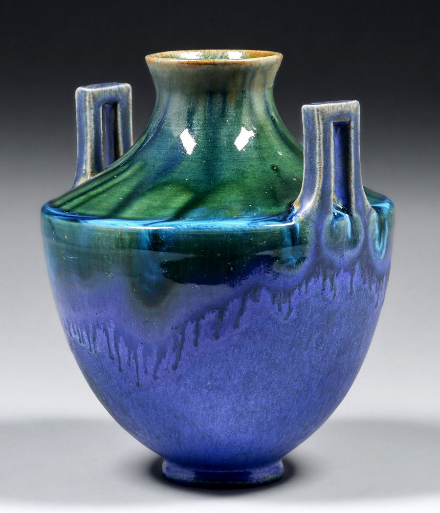 Fulper Pottery Two Cutout Handle Vase c1910. Signed. Perfect condition. 9.75″h x 7.5″d SOLD
