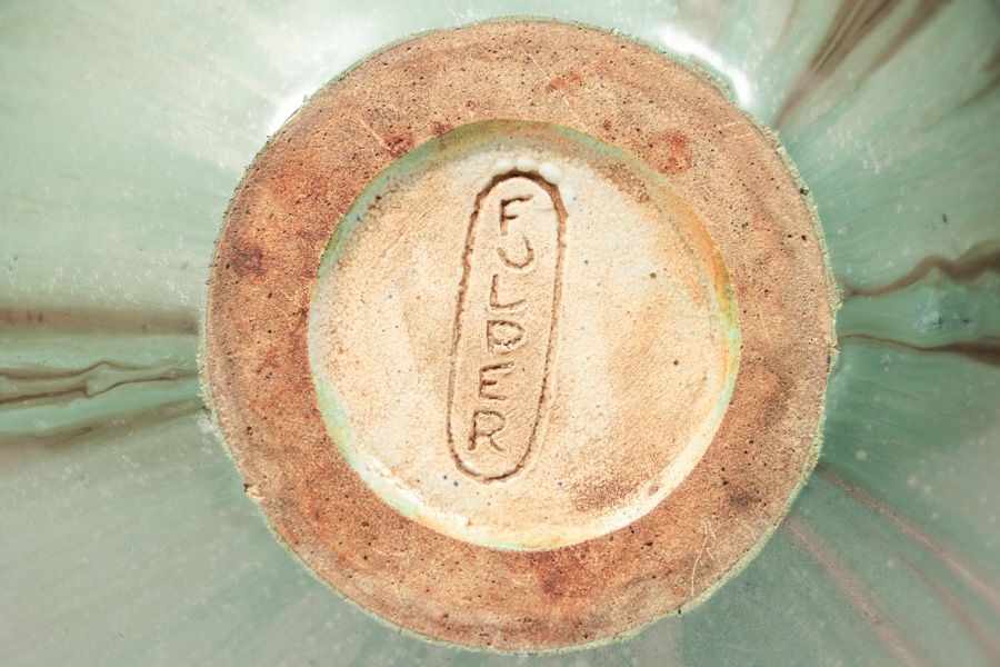 Fulper Pottery Two-Handle Copperdust Green Flambe Vase c1910s. Signed. A very successful example of this classic form in perfect condition. 9.5″h x 8″w