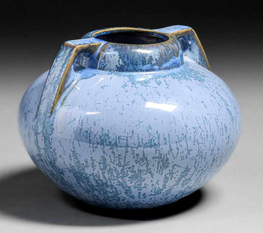 - Fulper Pottery Two-Handled Blue Snowflake Crystalline Vase c1910s
