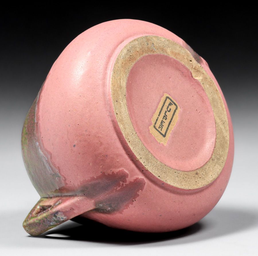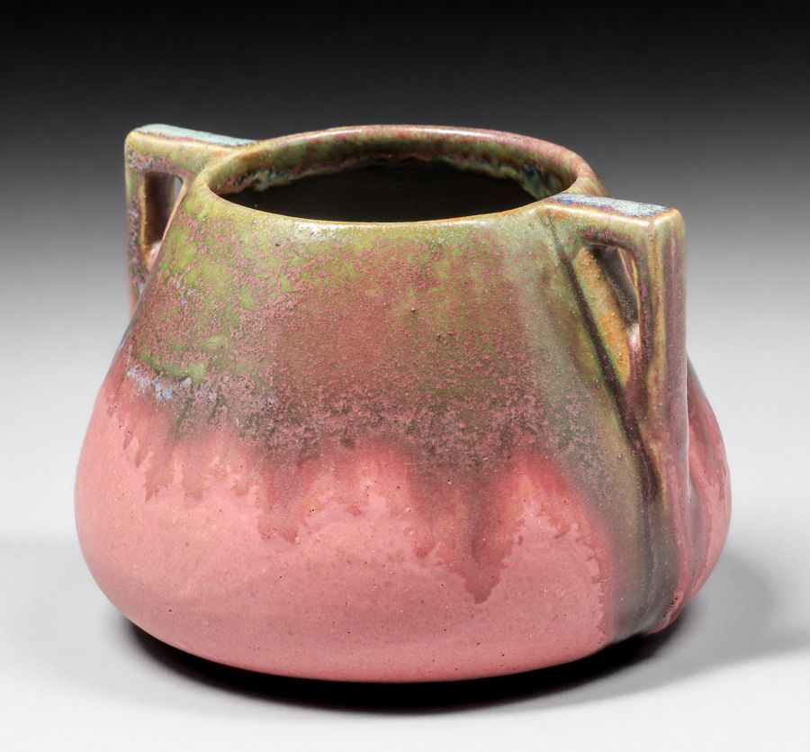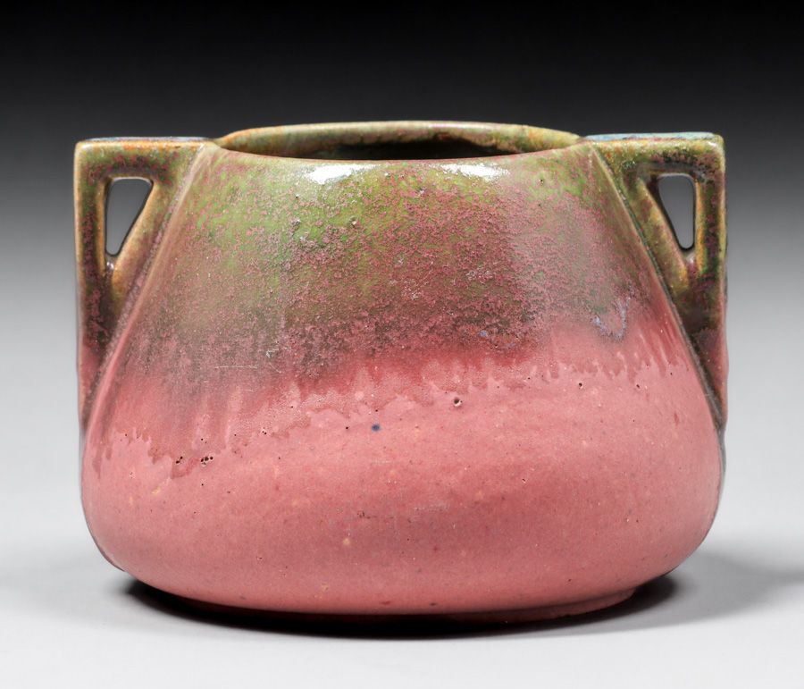 Fulper Pottery Two-Handled Celadon Green over Matte Pink Vase c1910s. Signed. A couple of tiny grinding flecks, otherwise perfect condition. 6"w x 4.25"h SOLD