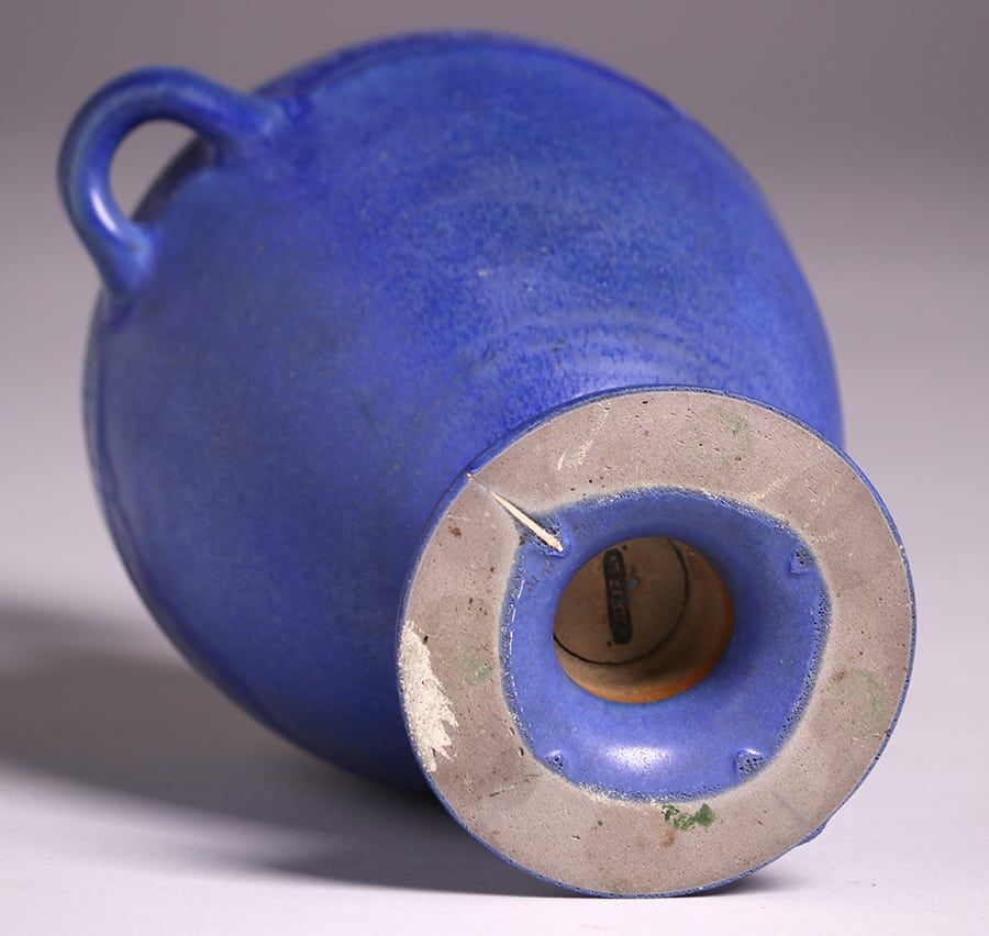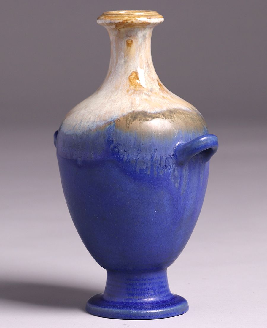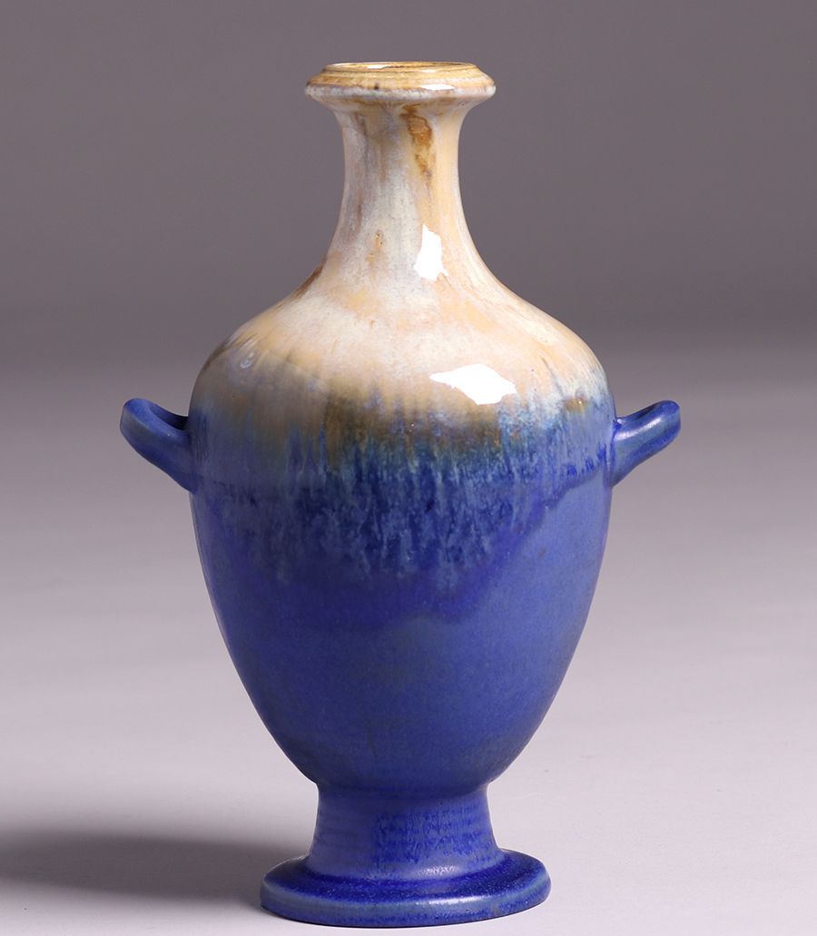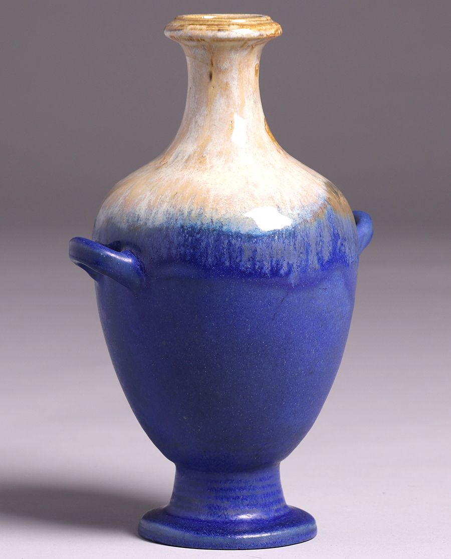 Rare Fulper Pottery two-handled Grecian Urn-shaped vase with ivory over matte blue glaze. Signed. Perfect condition. 10.75"h x 7"w SOLD