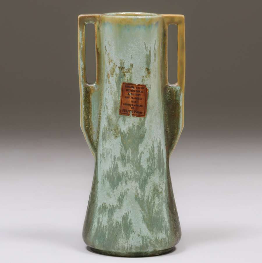 Fulper Pottery Two-Handled Green Vase 1915. Rare Panama Pacific International Exposition Label on front. Restoration to handle otherwise perfect condition. 11" h x 5"d SOLD