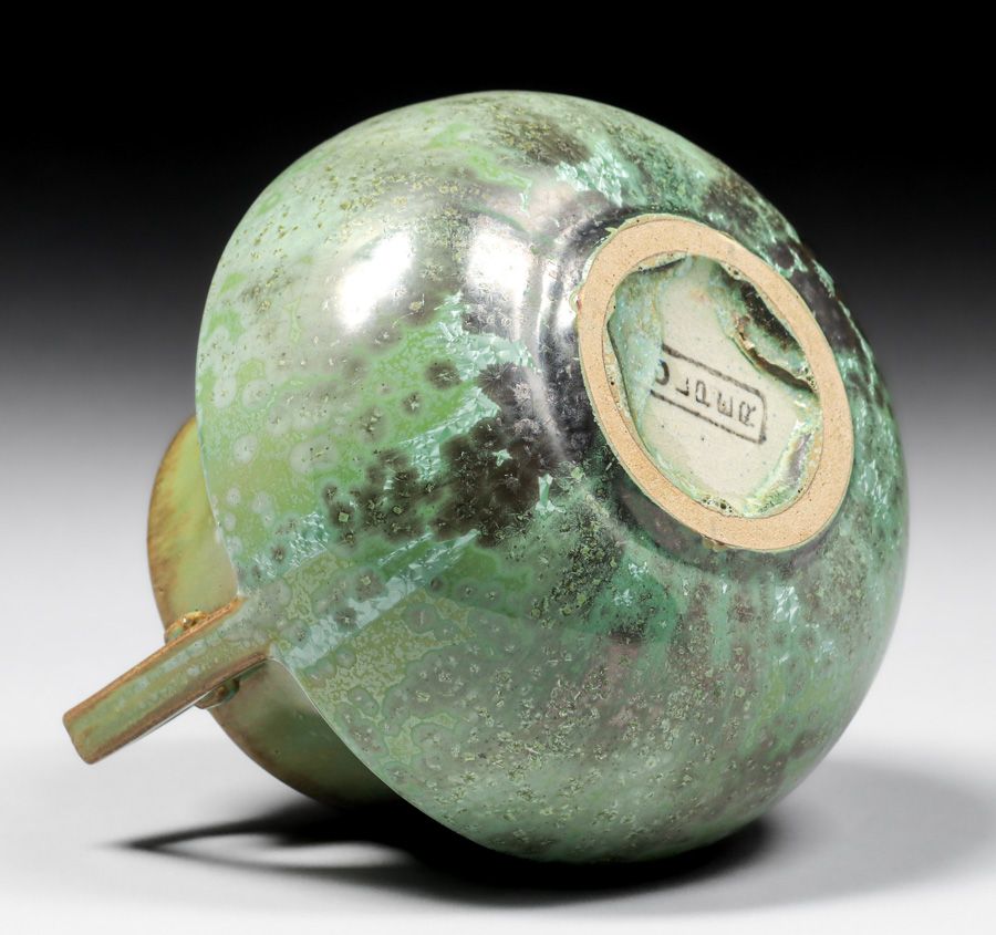 Fulper Pottery Two-Handled Leopardskin Vase c1910s. Signed. Perfect condition. 4.5"h x 5.75"d SOLD