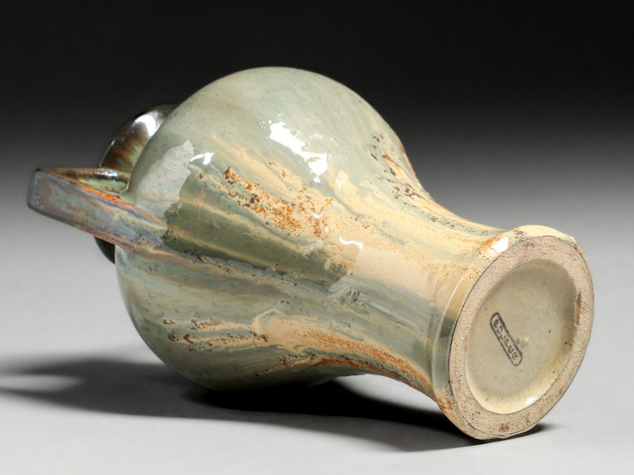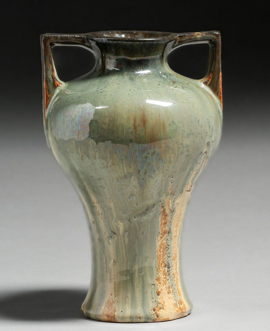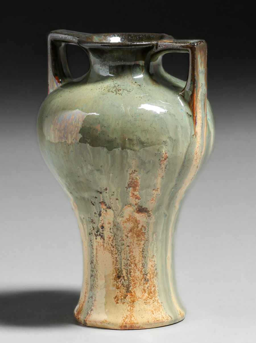 - Fulper Pottery Two-Handled Mirror Black Butterscotch Flambe Vase c1910