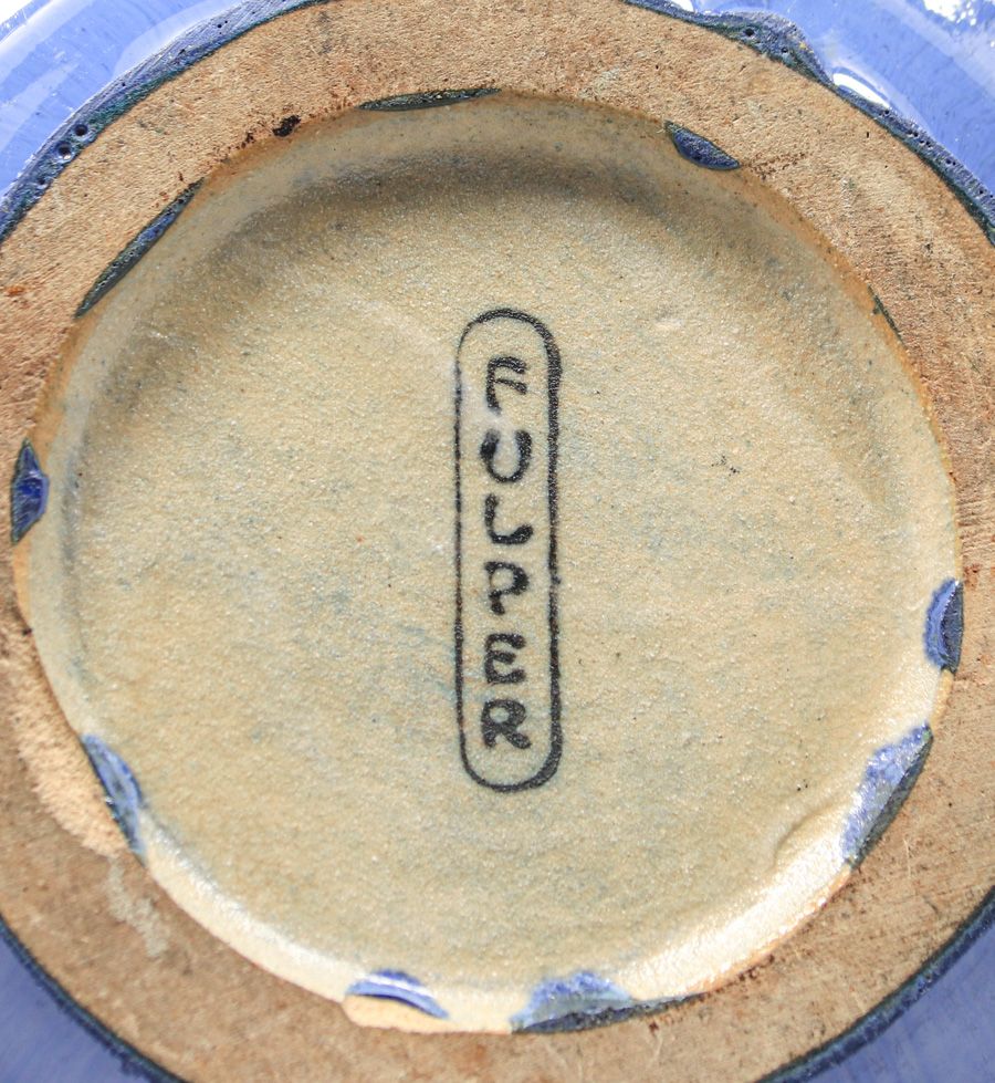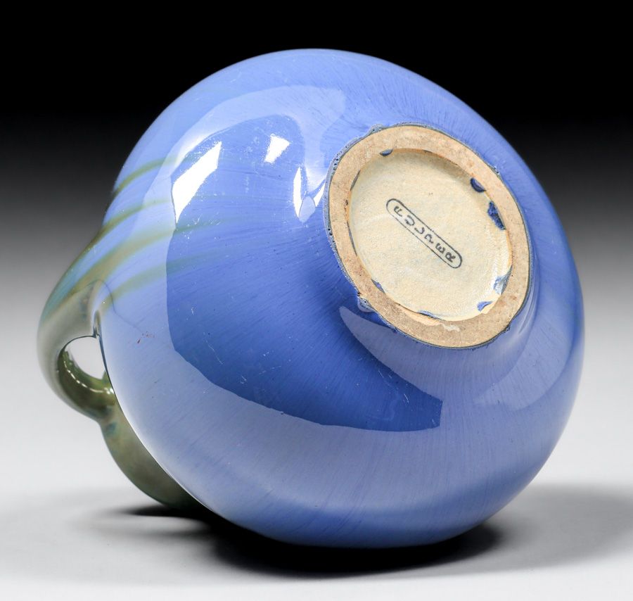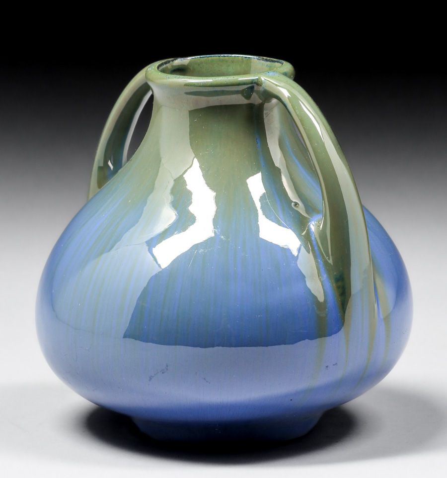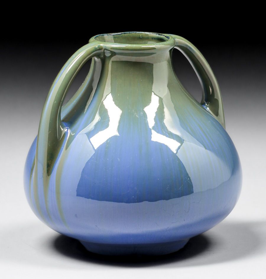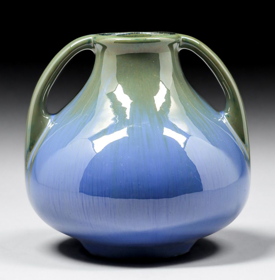 - Fulper Pottery Two-Handled Olive Green & Blue Flambe Vase c1917-1920