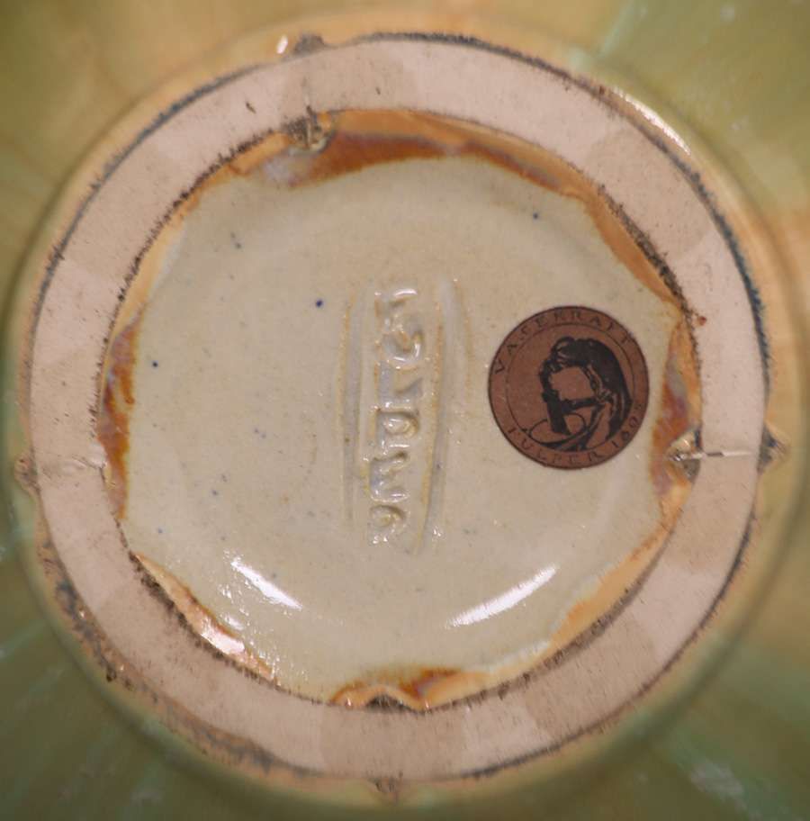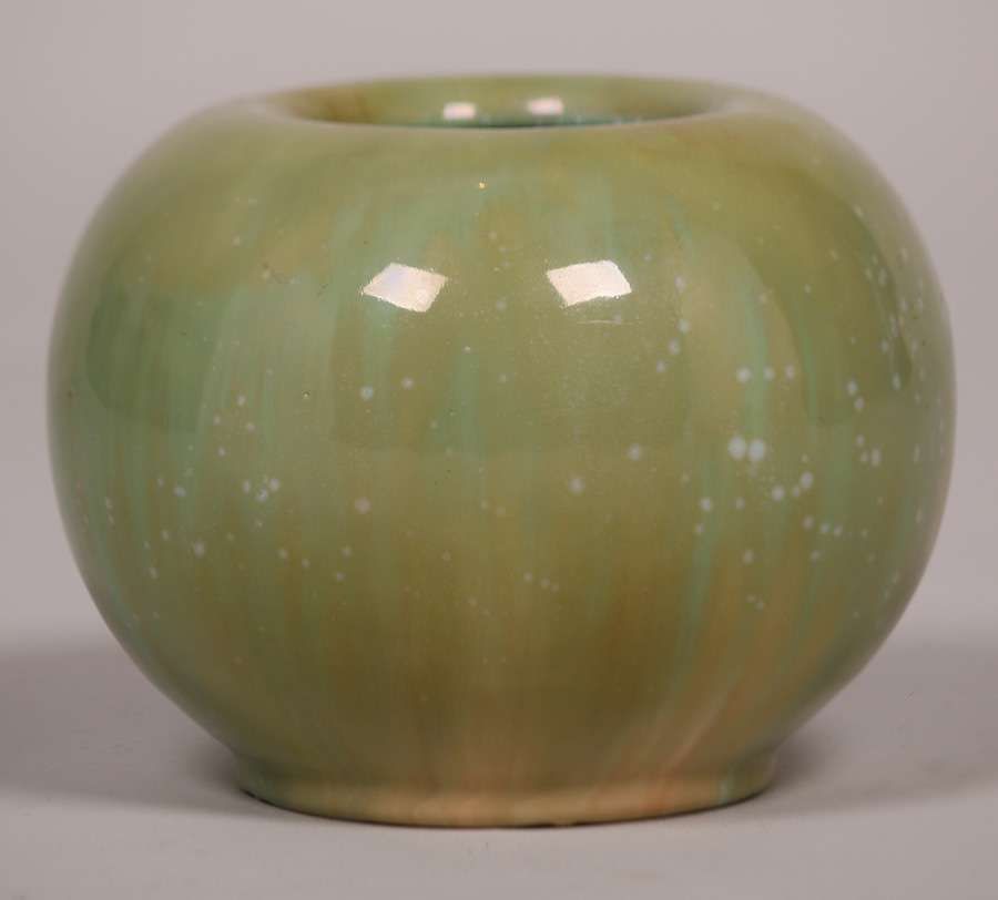 Fulper Pottery spherical vase with a cucumber green glaze. Signed with incised mark and Vasecraft paper label. 5.5"h x 5.75"d SOLD