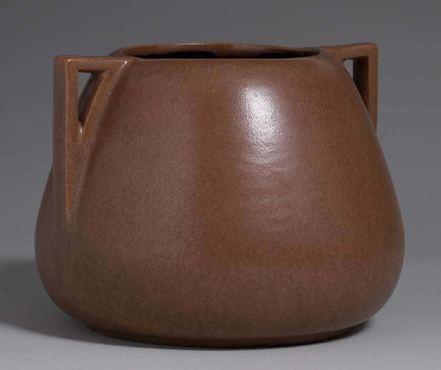 Large Fulper Pottery two-handle vase with Mission matte brown glaze. Signed. Perfect condition. 7.5″h x 9.5″w SOLD