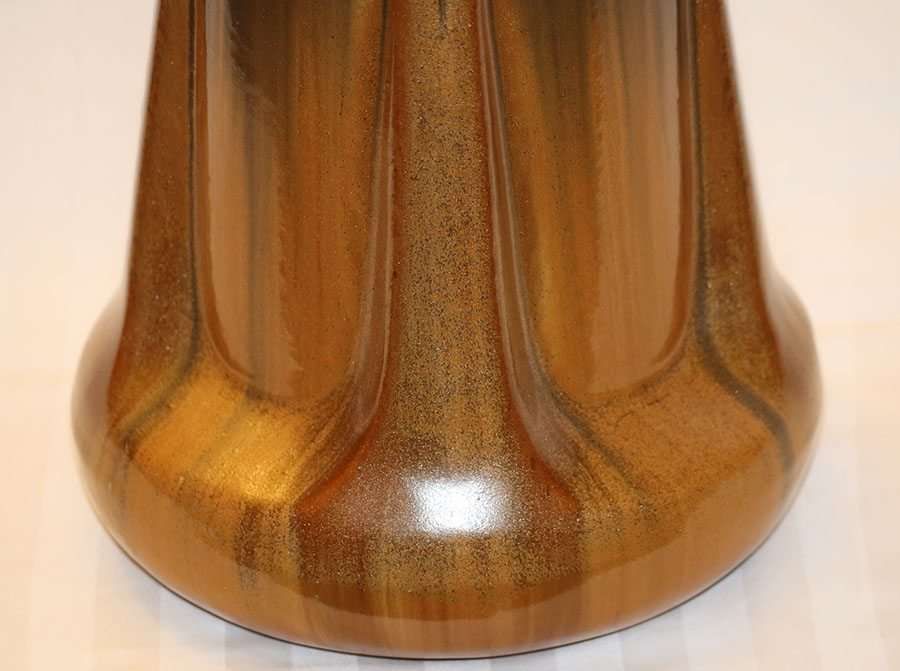 Large Fulper Pottery buttress vase with an incredible orange to black copperdust glaze. Signed. Perfect condition. This is the 2nd largest of this form with one of the best copperdust glazes we have seen on this form. 12"h SOLD