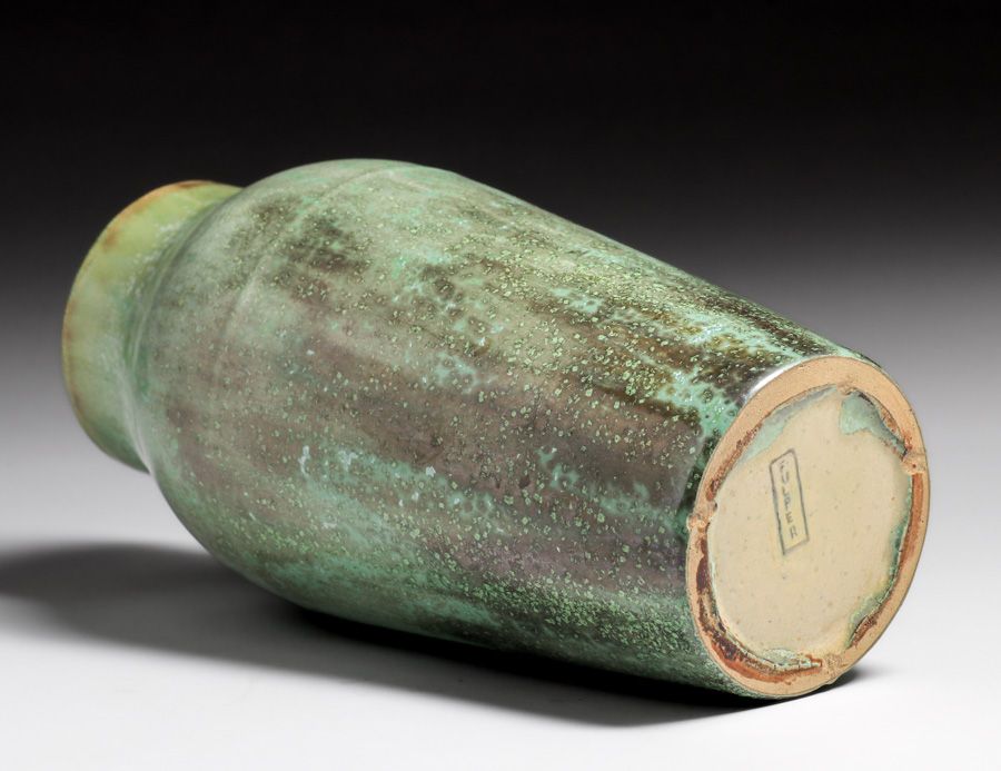 Large Fulper Pottery Cucumber Green Vase c1910s. Signed. Perfect condition. 12 5/8"h x 5.5"d SOLD