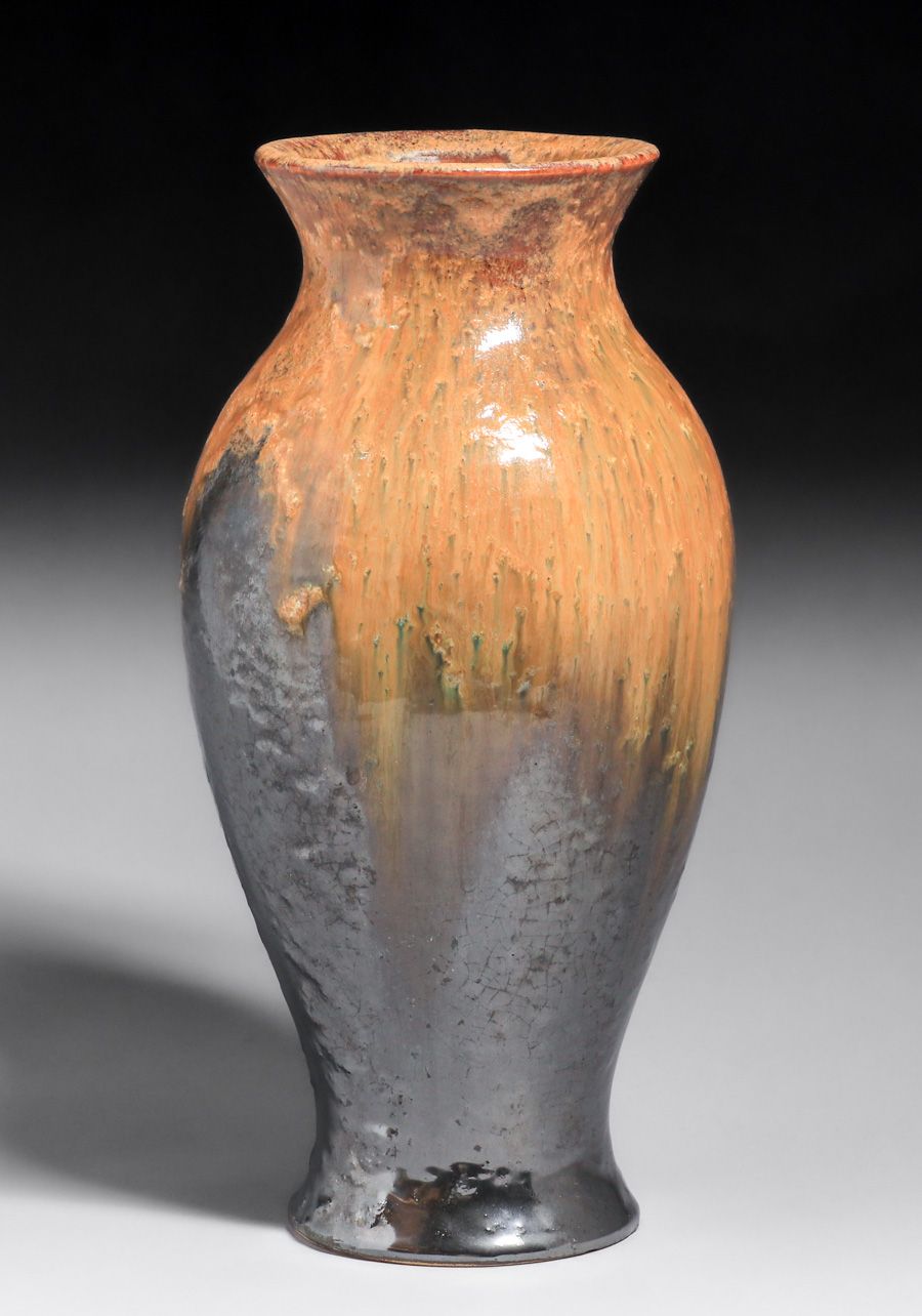- Large Fulper Pottery Orange & Mirror Black Flambe Vase c1910