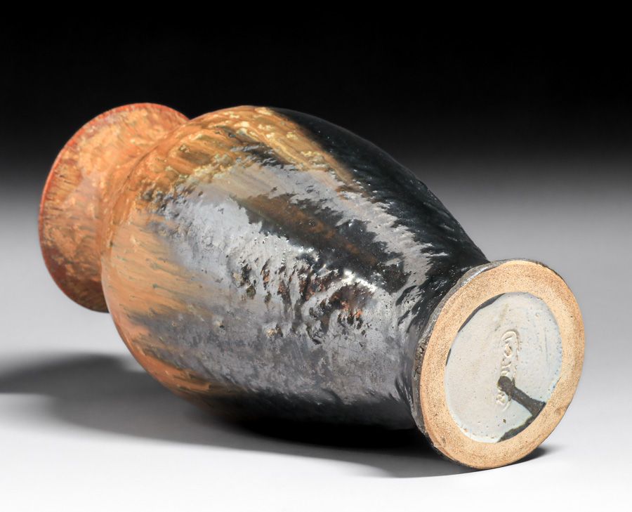 Large Fulper Pottery Orange & Mirror Black Flambe Vase c1910. Incredible mottled and textured surface. Signed. Invisible professional restoration to small base chip, otherwise perfect condition. 13.25"h x 5.75"d SOLD