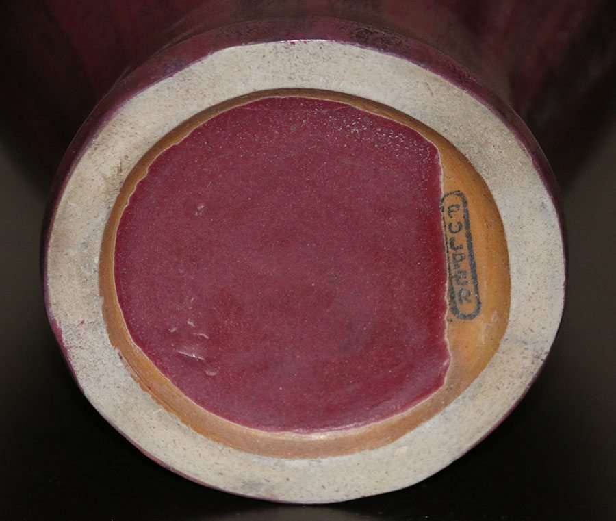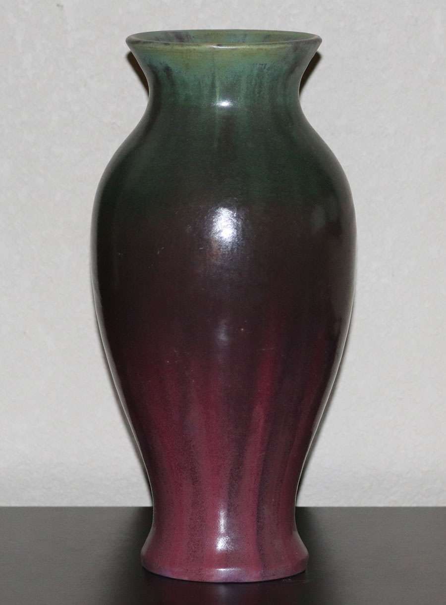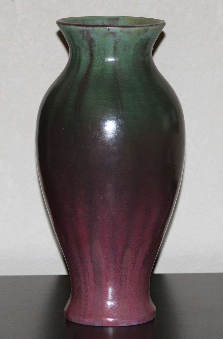 Large Fulper Pottery baluster-shaped vase with a matte green and pink glaze. Signed. Invisible professional repair to small rim chip. 13.5"h SOLD