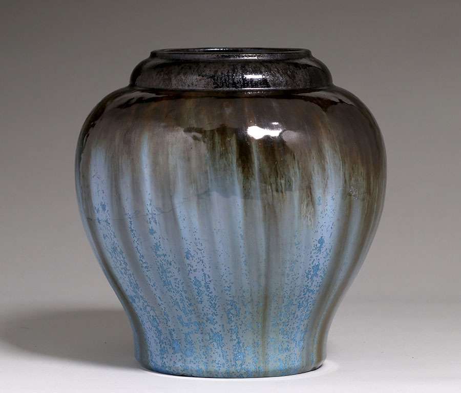 Massive Fulper Pottery bulbous vase with mirror black and blue crystalline flambe glaze c1910. In-body line in base, otherwise perfect condition. 12"h x 11"d SOLD