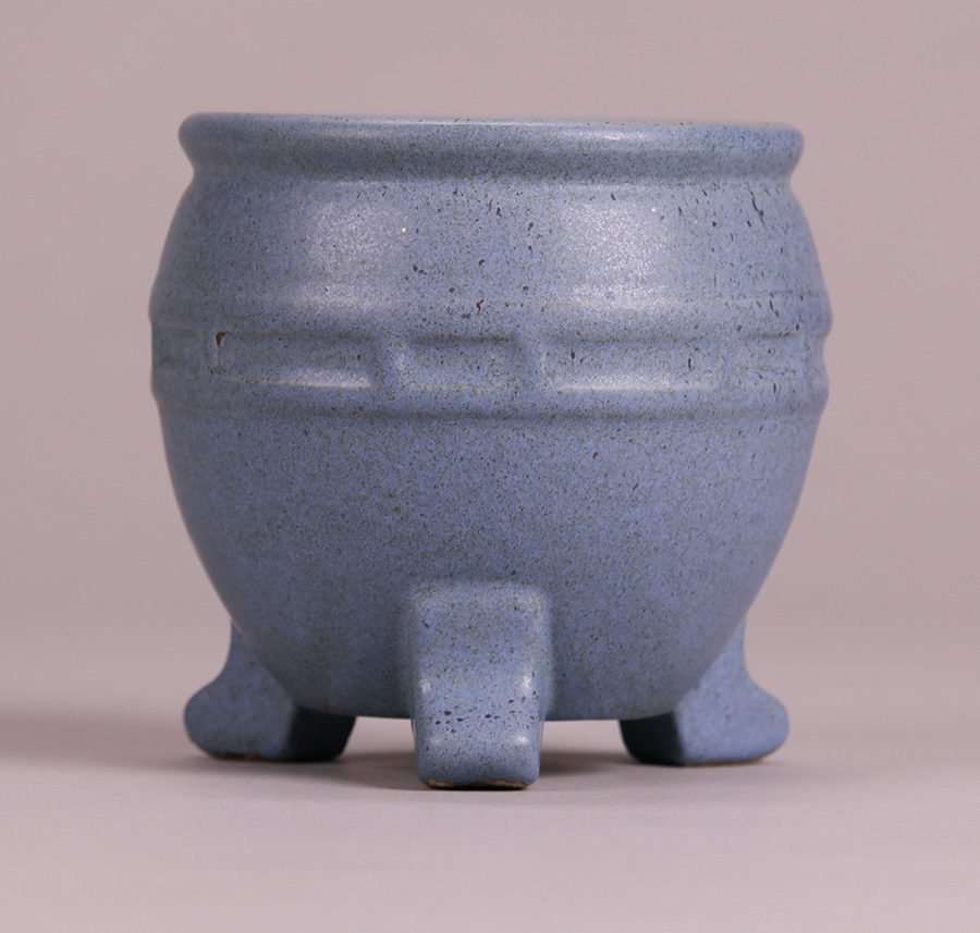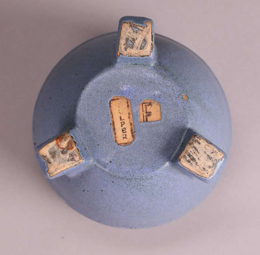 Rare, early experimental Fulper matte blue vase. Signed with early rectangular inkstamp mark and the letter "F". Pieces marked with letters are extremely rare and probably designate glaze trials during the first year or two. A couple of glaze skips in the interior otherwise perfect condition. 4.75"h x 4.75"d SOLD