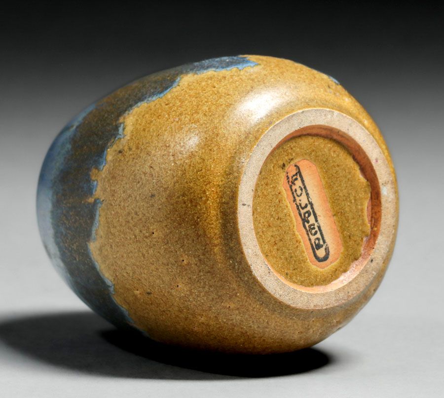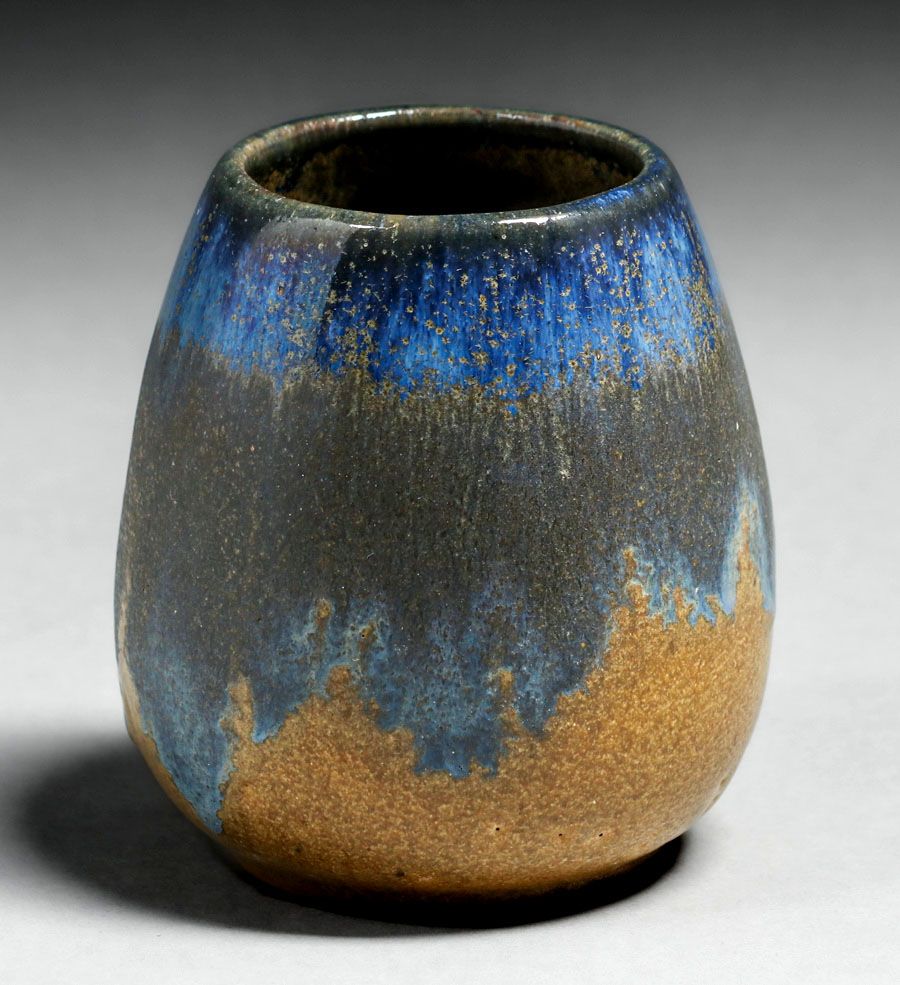 - Small Fulper Pottery Chinese Blue Drip over Matte Mustard Vase c1910s
