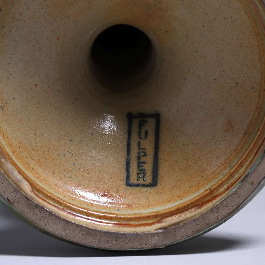 Tall Fulper Pottery candlesticks with an Elephant's Breath flambe over an incredible cucumber-leopard's skin glaze. Signed. Tight hairlines in base of each and invisible, professional restoration to rim chip and slight unevenness to rims. 15.5"h x 5.25"d SOLD