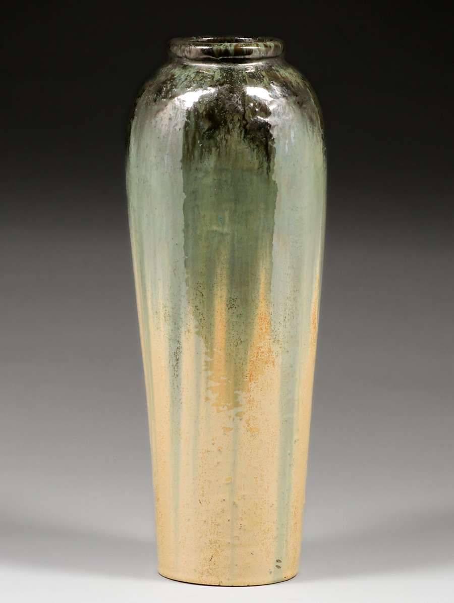 - Tall Fulper Pottery Mirror Black & Elephants Breath Flambe Vase c1910