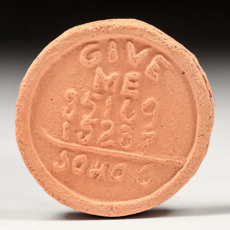 George Ohr Brothel Token c1895. Literature: George Ohr: The Greatest Art Potter on Earth, Hecht, pg. 57. Unsigned. Excellent condition. 1.25″d