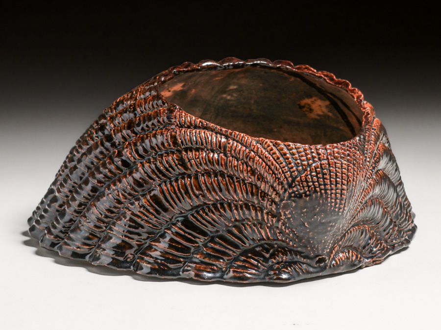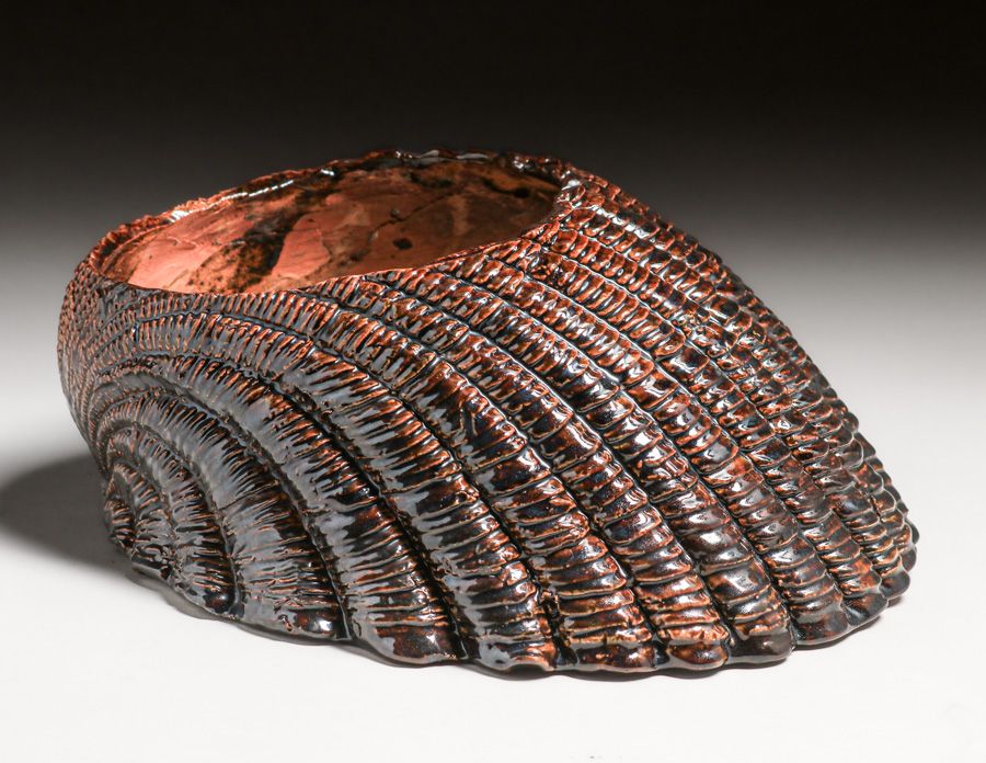 Large George Ohr Pottery Inkwell Shell c1900. Signed. Invisible professional restoration to kiln kiss, otherwise perfect condition. Approximately 11"d x 4.5"h SOLD