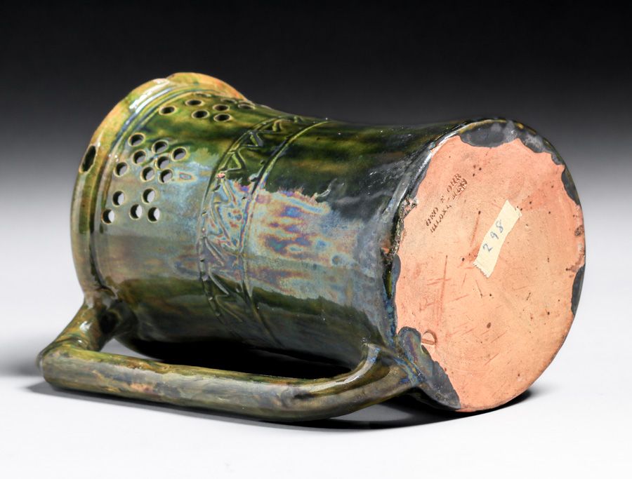 Large George Ohr Puzzle Mug c1890s. This mug is much, much bigger than the normal George Ohr Puzzle Mug. Signed. Invisible professional restoration to handle, otherwise perfect condition. 7.5"h x 6.5"w x 5.5"d SOLD